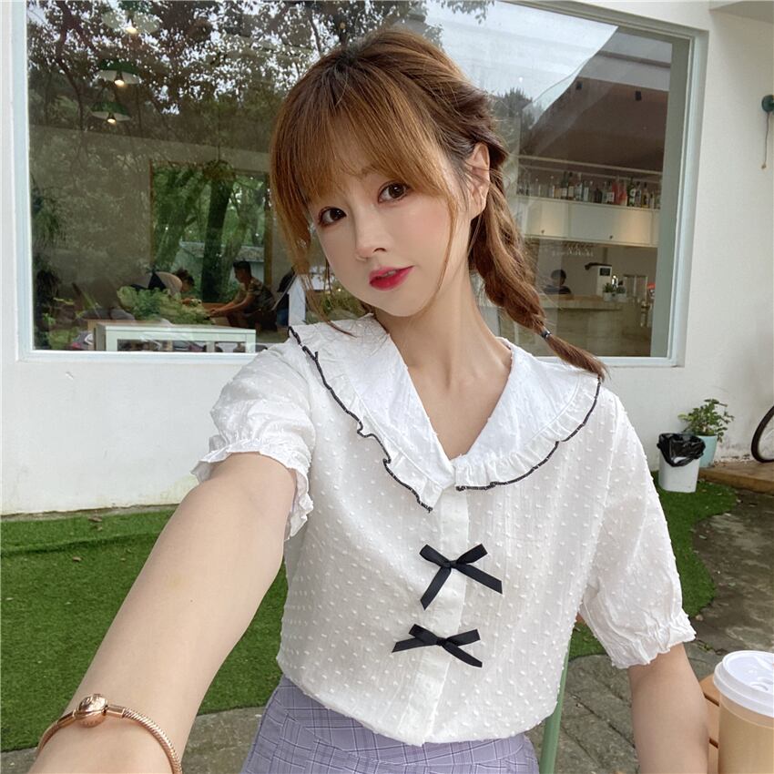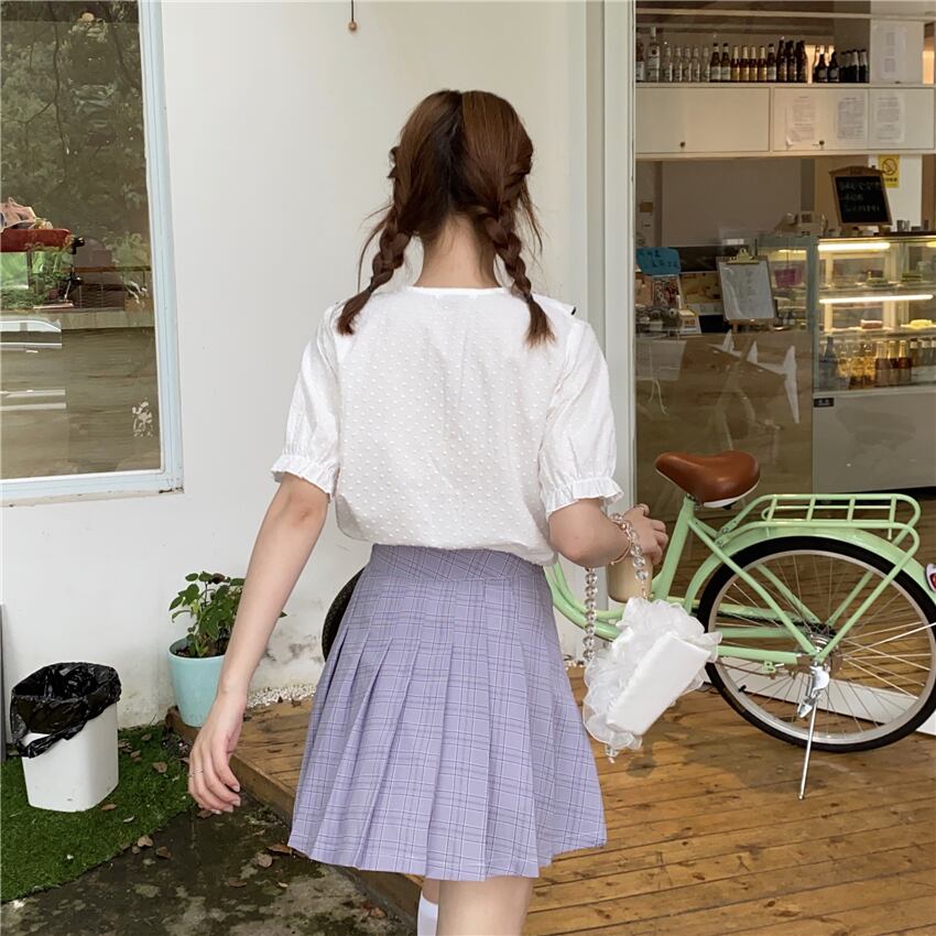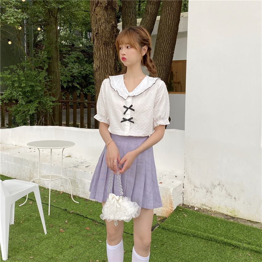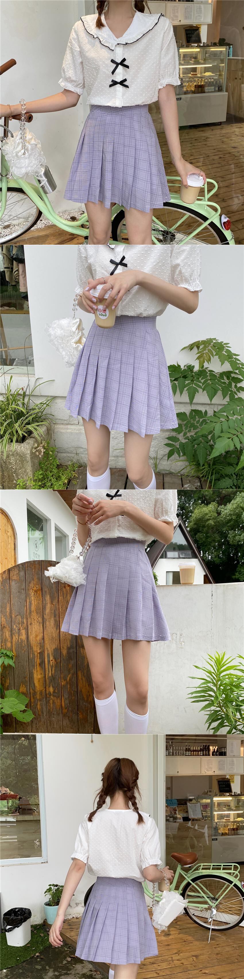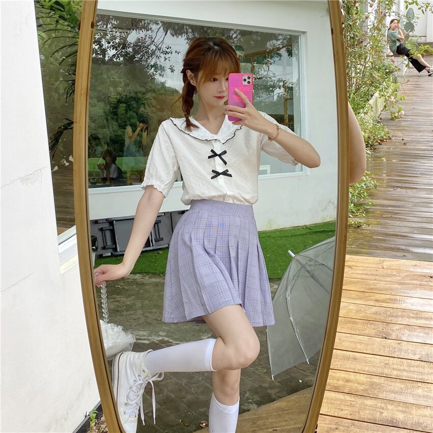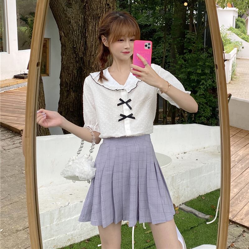✞ リボン半袖スリーブシャツブラウススタンダードチェック柄プリーツスカート ショート レトロ スウィート ✞ゴスロリ SM ミリ 甘ロリ クラロリ 和ロリ エレガント 黒ロリ 姫ロリ 華ロリ BB-BB8892528