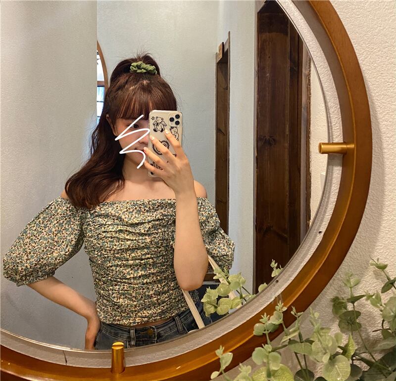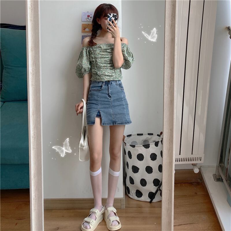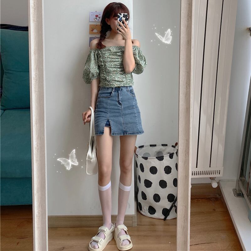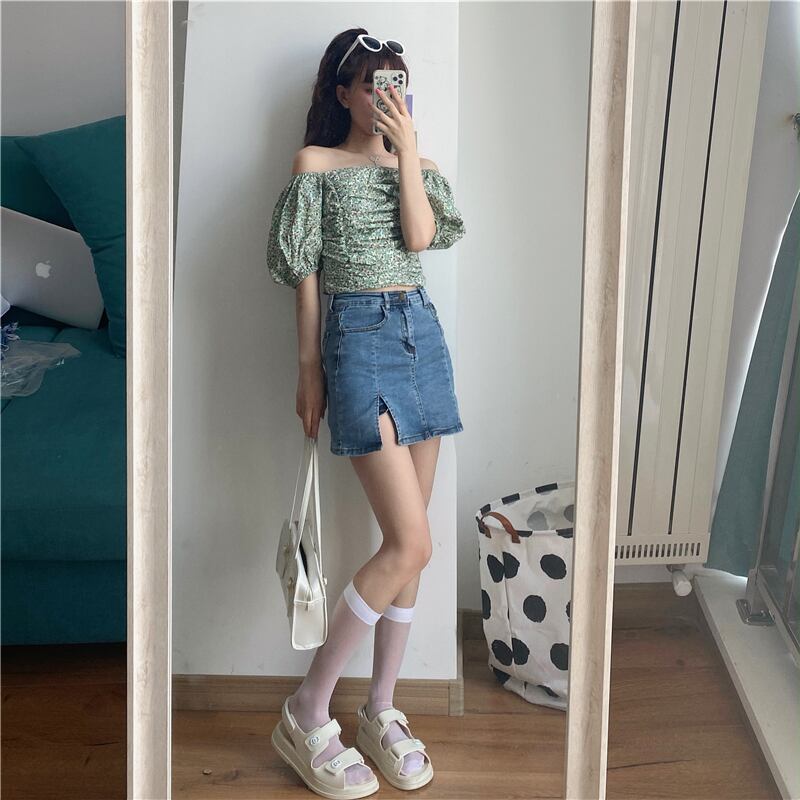 色:グリーンフローラルトップワンピース,デニムスカートワンピース
