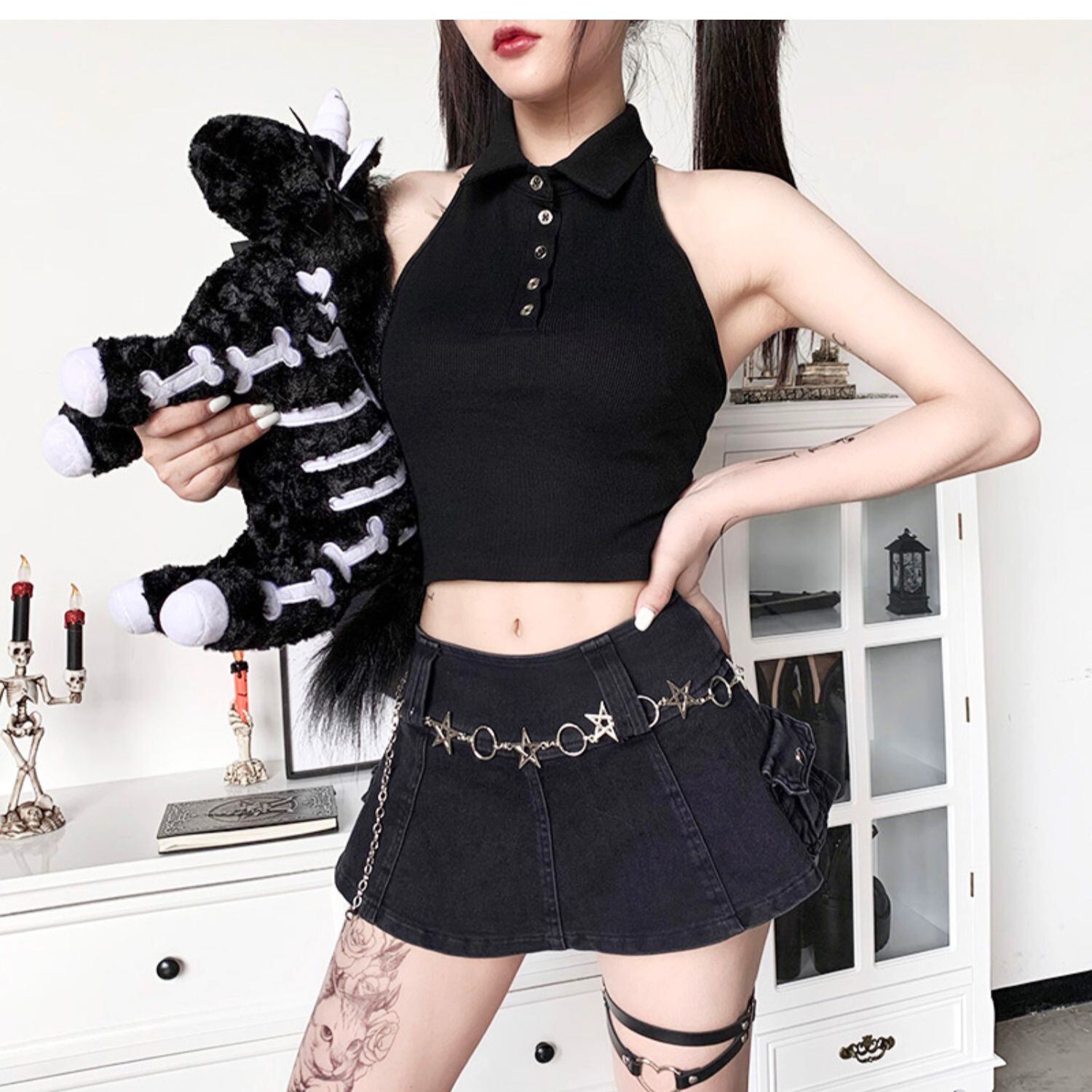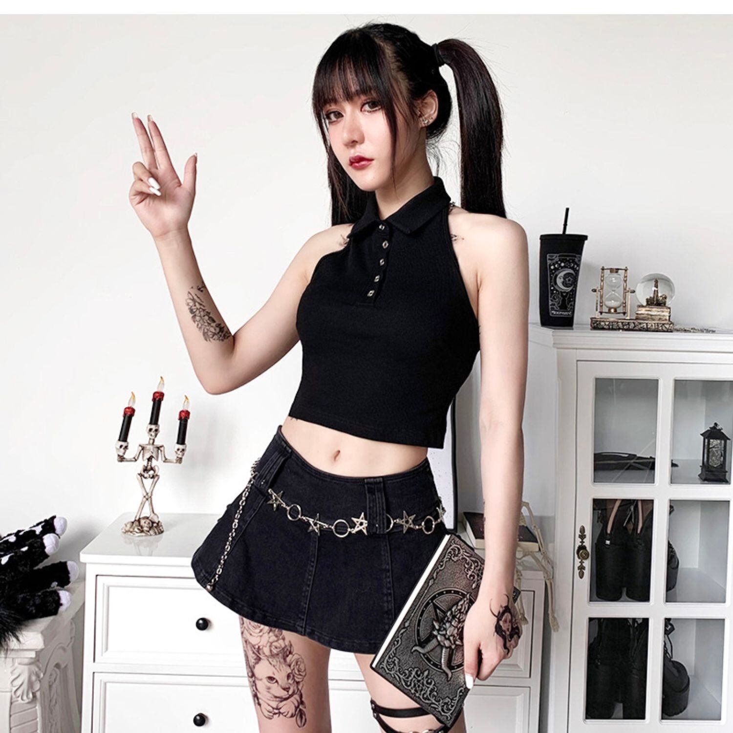 ✞✝✞ ホルターTシャツ ショートブラックボタンノースリーブストラップレストップス 大人女子☆ ✞✝✞ ゴスロリ SM ミリ 甘ロリ クラロリ 和ロリ エレガント 黒ロリ 姫ロリ 華ロリ AA-AA9968152