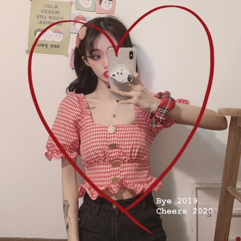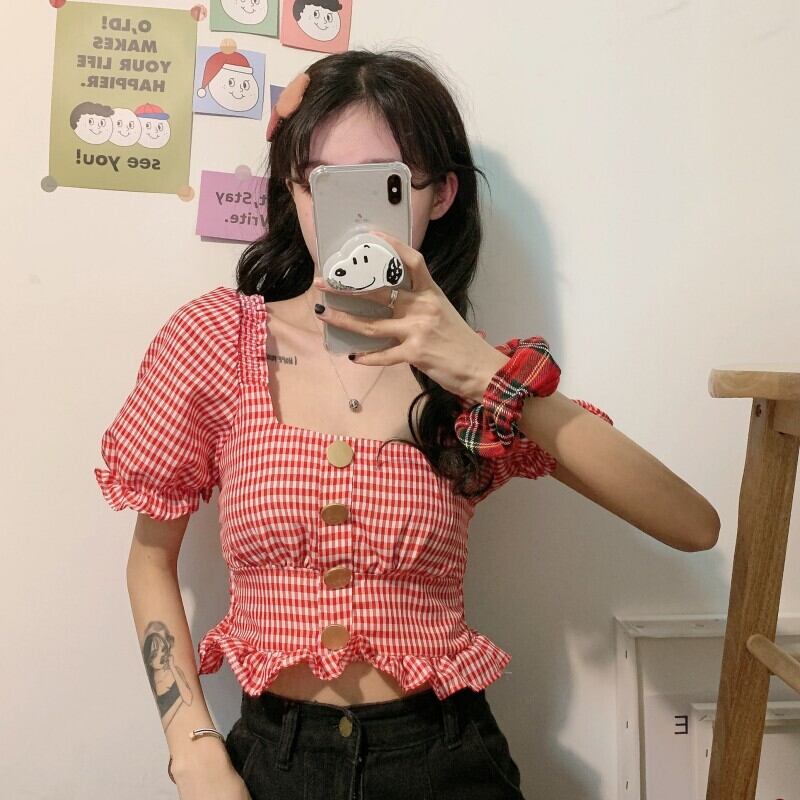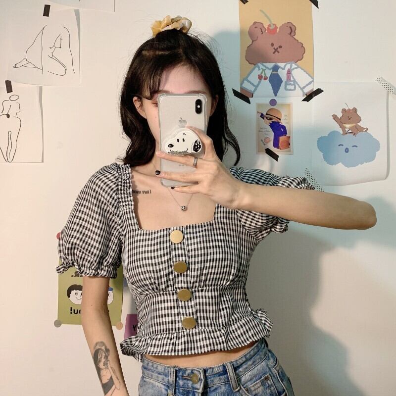 ✞ おしゃれブラックxホワイトチェック柄☆スクウェアネックパフスリーブシャツブラウス ショート トップス レトロ ✞ゴスロリ SM ミリ 甘ロリ クラロリ 和ロリ エレガント 黒ロリ 姫ロリ 華ロリ BB-BB5777684