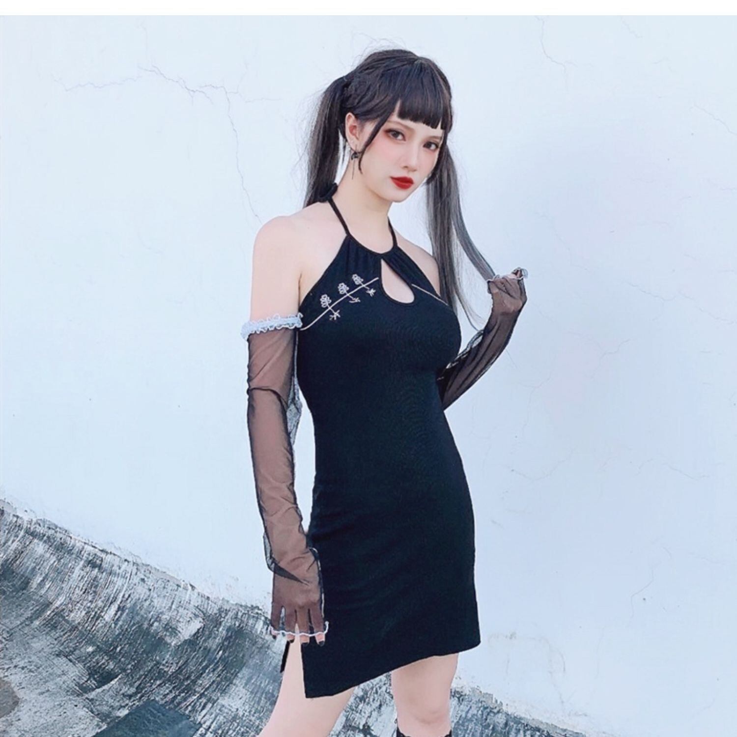 ✞✝✞ チャイナ風レース刺繍サイドブラック レースアップ ステッチ ✞✝✞ ゴスロリ SM ミリ 甘ロリ クラロリ 和ロリ エレガント 黒ロリ 姫ロリ 華ロリ AA-AA5115408