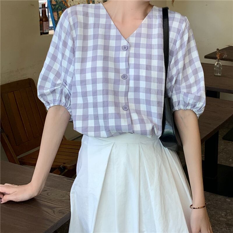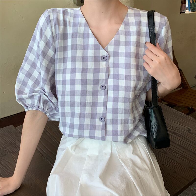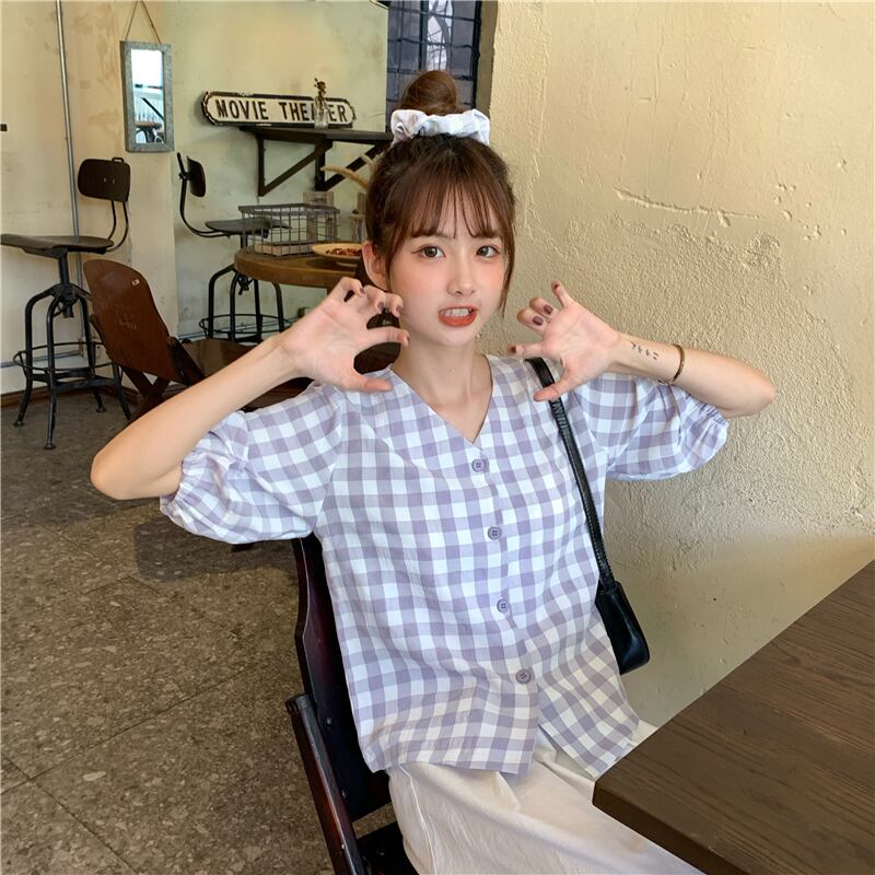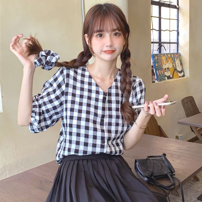 ✞ スタンダードチェック柄Vネックスリム♥カワイイ♥スリーブシャツブラウストップス レトロ スウィート ✞ゴスロリ SM ミリ 甘ロリ クラロリ 和ロリ エレガント 黒ロリ 姫ロリ 華ロリ BB-BB3873217