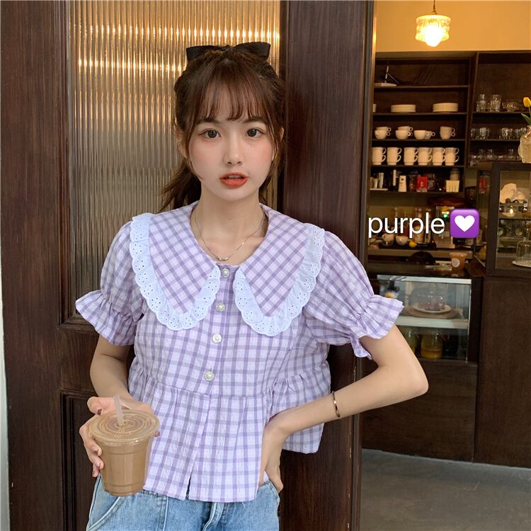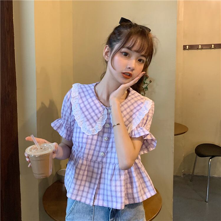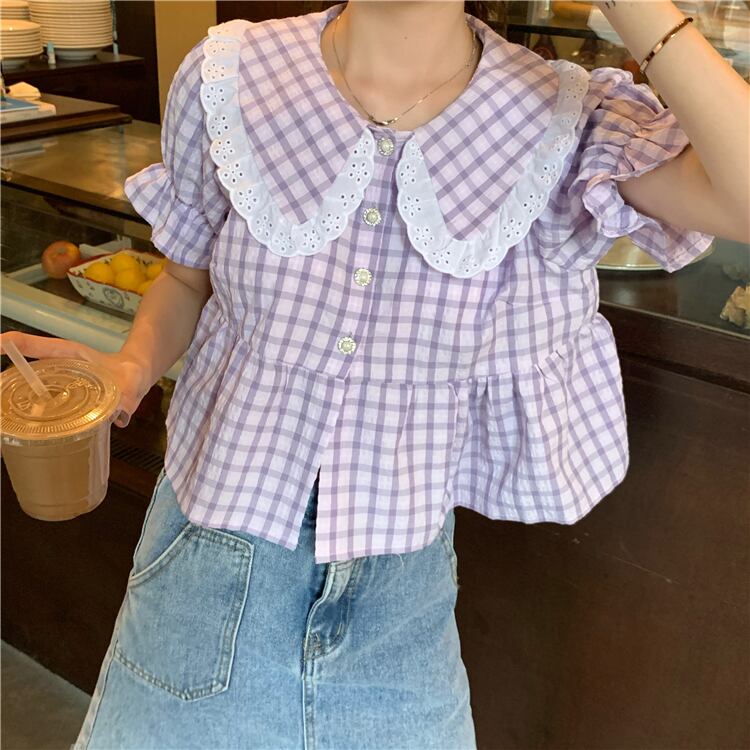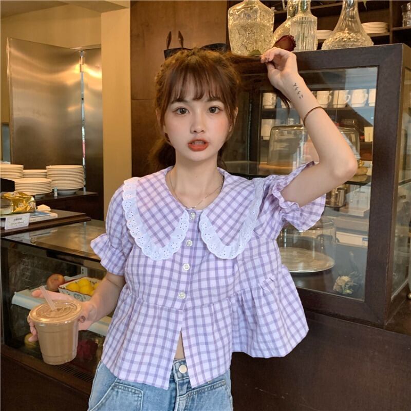 ✞ スタンダードチェック柄半袖スリーブシャツブラウストップス ショート レトロ スウィート ステッチ ✞ゴスロリ SM ミリ 甘ロリ クラロリ 和ロリ エレガント 黒ロリ 姫ロリ 華ロリ BB-BB5361467