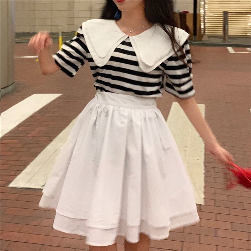 ✞ ネイビーきれいめ☆ストライプトップス ダブルスカート サマー スウィート 夏物 ✞ゴスロリ SM ミリ 甘ロリ クラロリ 和ロリ エレガント 黒ロリ 姫ロリ 華ロリ BB-BB1211111