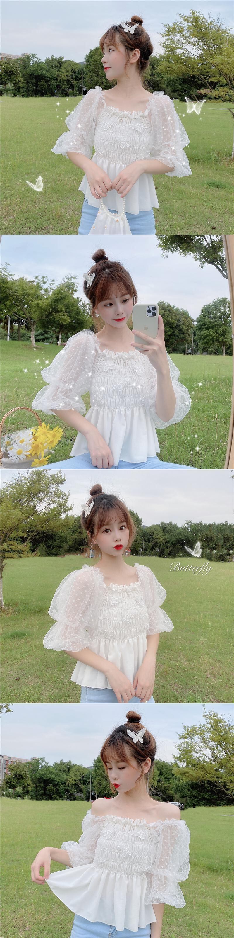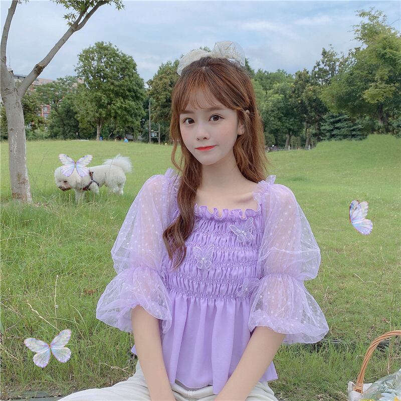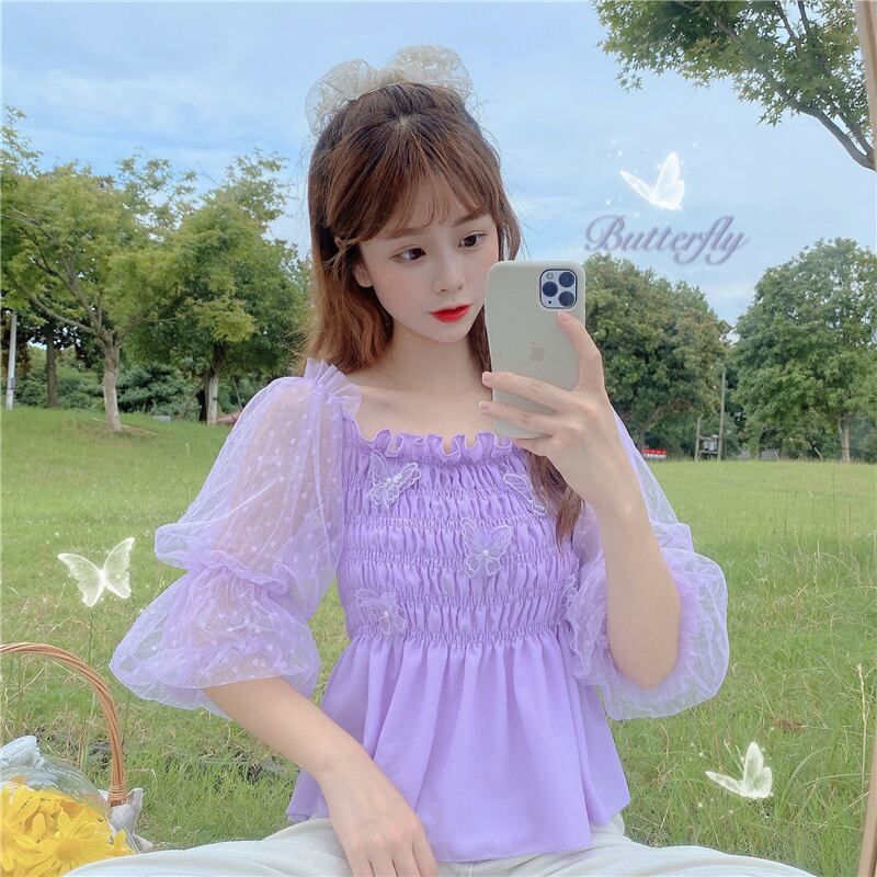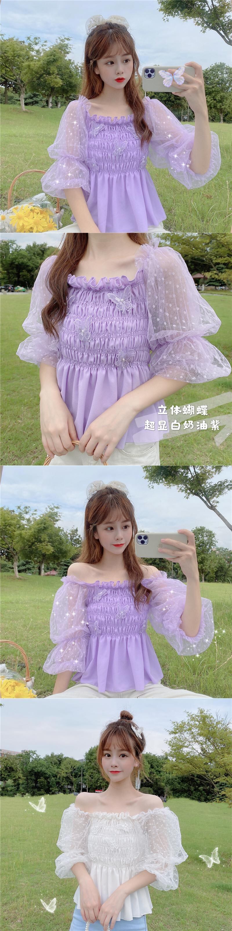 ✞ Butterflyデザイン メッシュスリーブプリーツスリムショートシャツブラウス スウィート スクウェア ステッチ ✞ゴスロリ SM ミリ 甘ロリ クラロリ 和ロリ エレガント 黒ロリ 姫ロリ 華ロリ BB-BB9573220