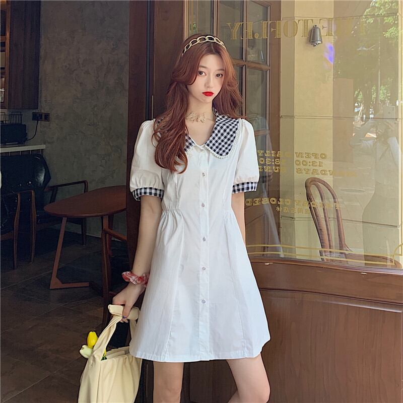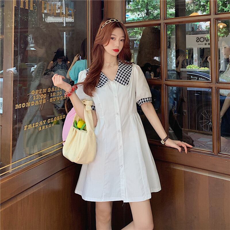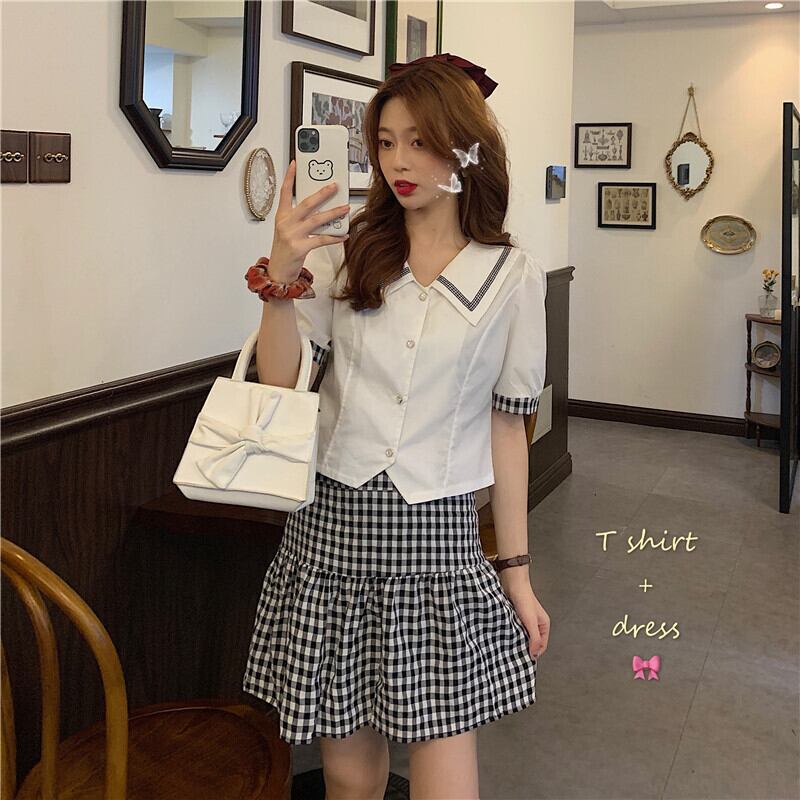 色:白ワンピース,ホワイトトップ,格子縞のスカートワンピース