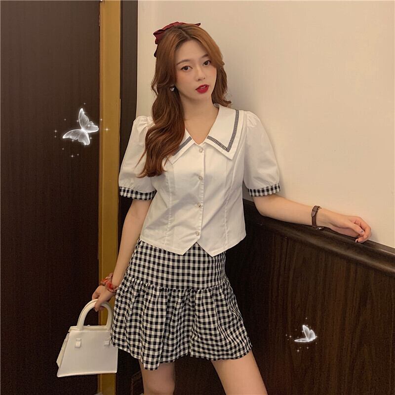 ✞ シャツブラウスきれいめ☆Aラインスカート チェック柄 ✞ゴスロリ SM ミリ 甘ロリ クラロリ 和ロリ エレガント 黒ロリ 姫ロリ 華ロリ BB-BB9842789