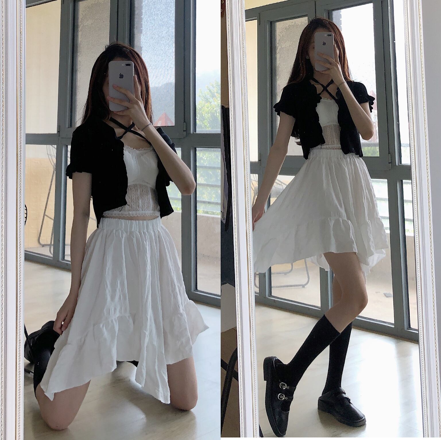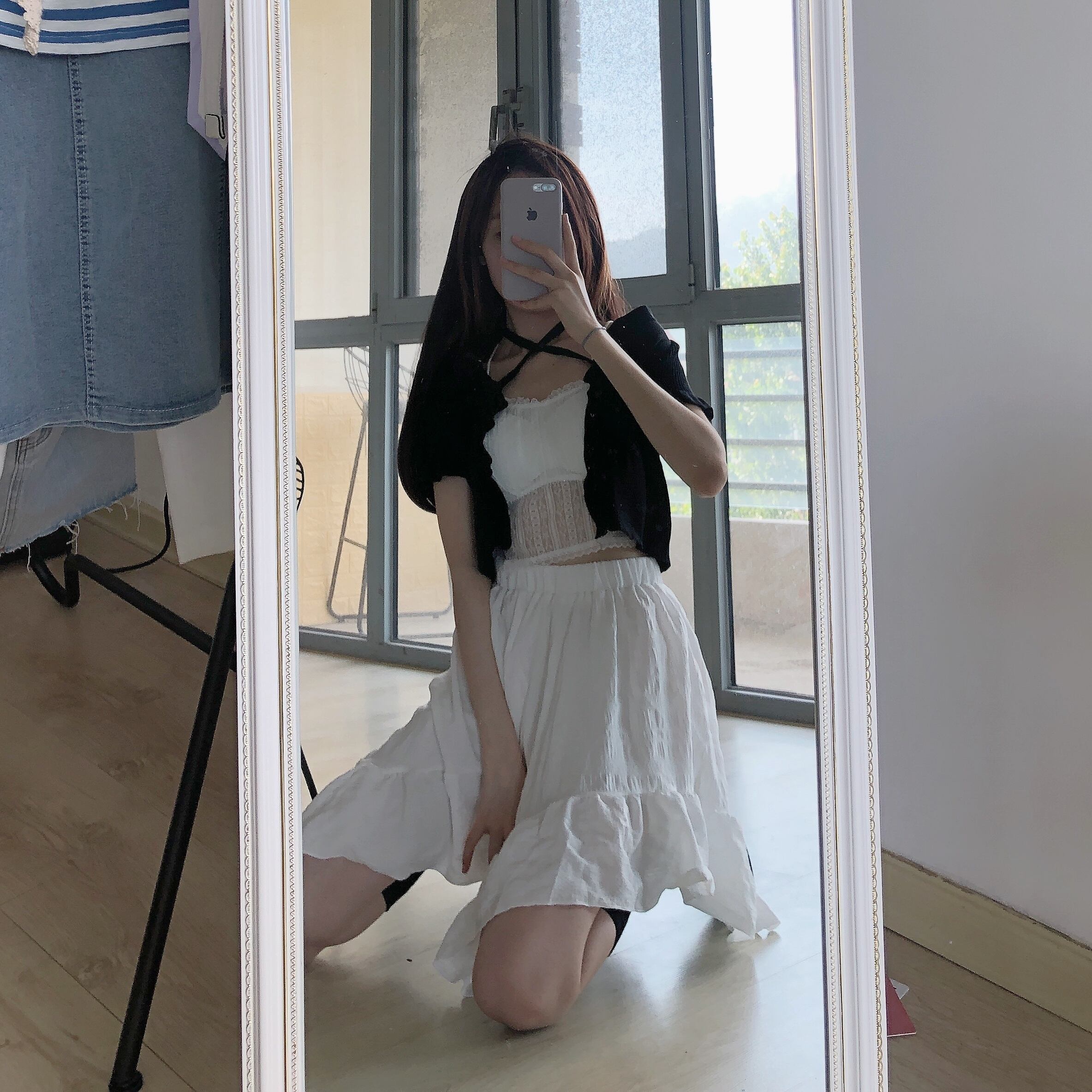 色:レースキャミソールワンピース,黒の半袖カーディガンワンピース,ホワイトスカートワンピース