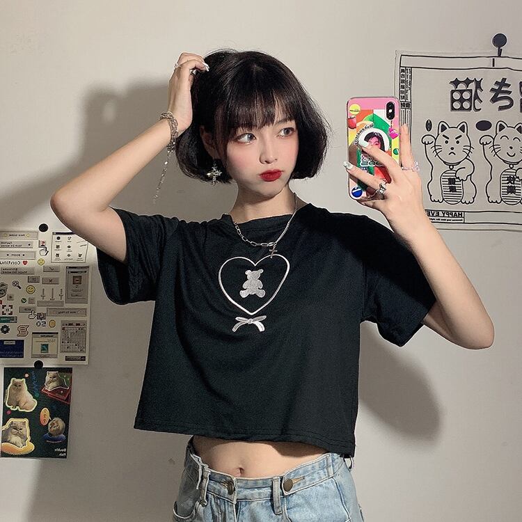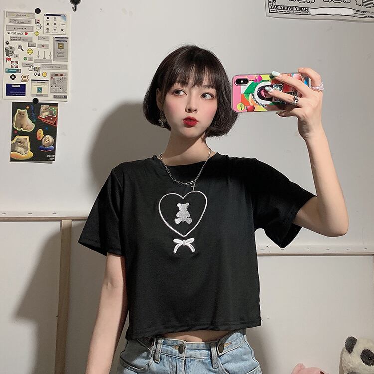 ✞ ショートハイウェスト刺繍くまTシャツ リボン トップス スウィート ガーリー ✞ゴスロリ SM ミリ 甘ロリ クラロリ 和ロリ エレガント 黒ロリ 姫ロリ 華ロリ BB-BB8010351