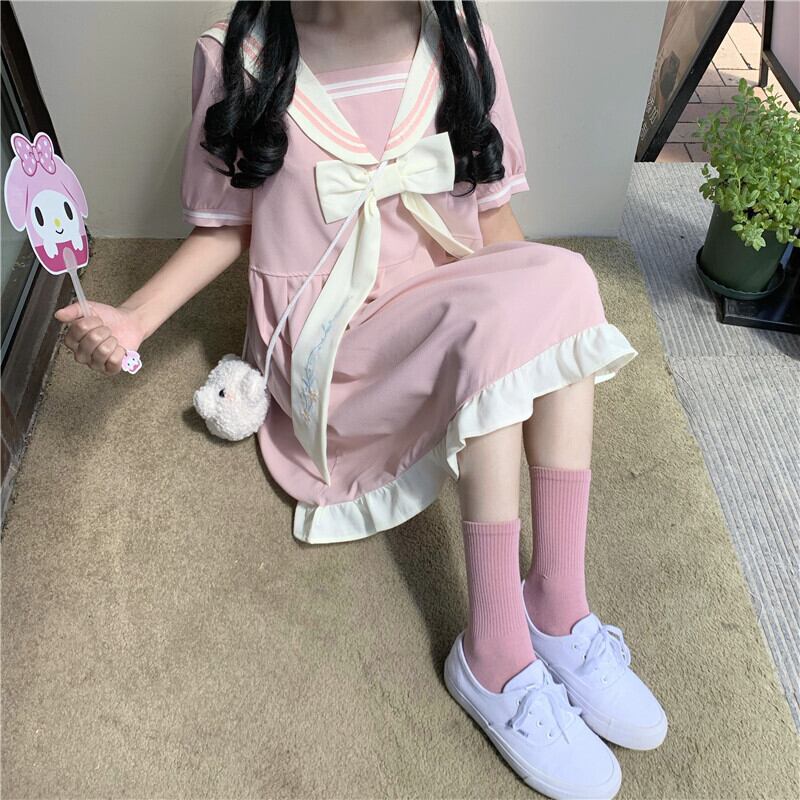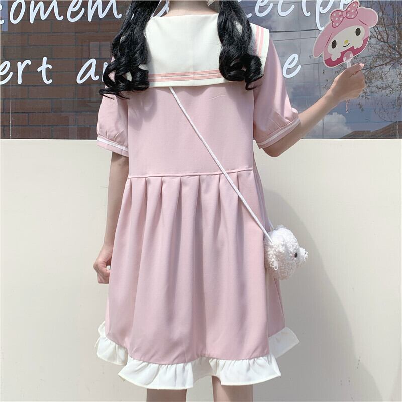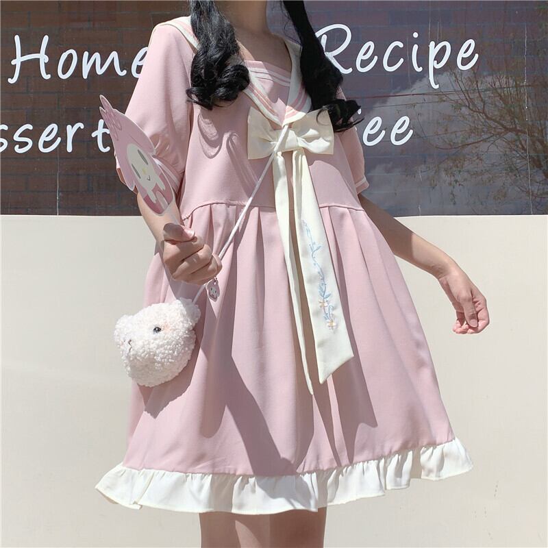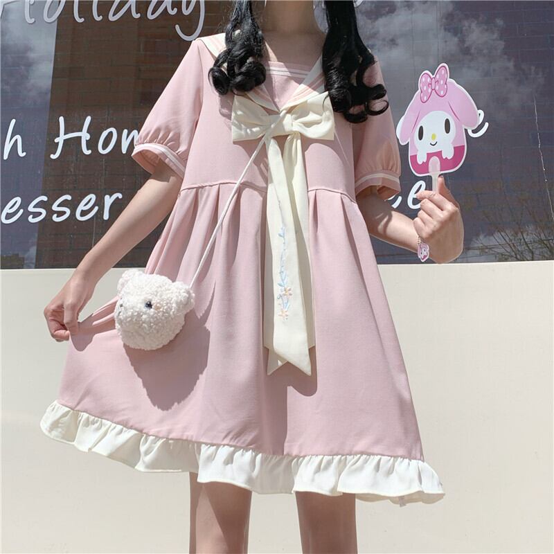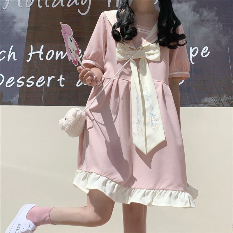 ✞ 甘めリボンピンク刺繍半袖パフスリーブフリルワンピースOP ♥セーラーカラー ショート ネイビー スウィート ステッチ ✞ゴスロリ SM ミリ 甘ロリ クラロリ 和ロリ エレガント 黒ロリ 姫ロリ 華ロリ BB-BB9915664