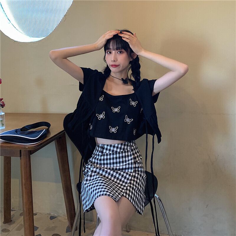 ✞ Butterflyデザイン 刺繍ショートレース半袖スリーブカーディガンウエストすっきり☆着痩せチェック柄Aラインスカート サマー 夏物 ✞ゴスロリ SM ミリ 甘ロリ クラロリ 和ロリ エレガント 黒ロリ 姫ロリ 華ロリ BB-BB6120630