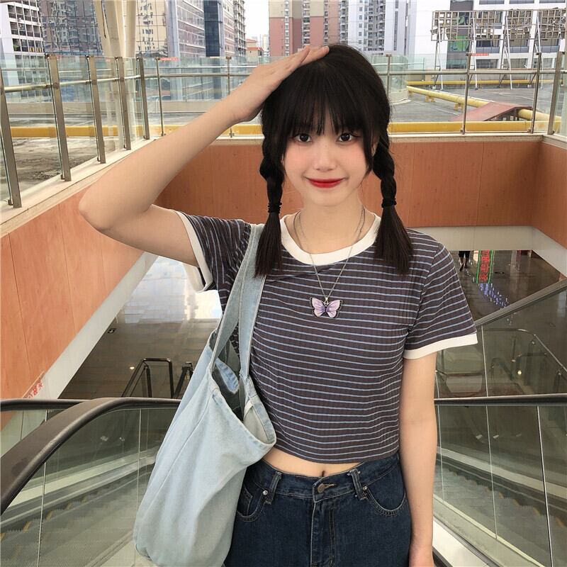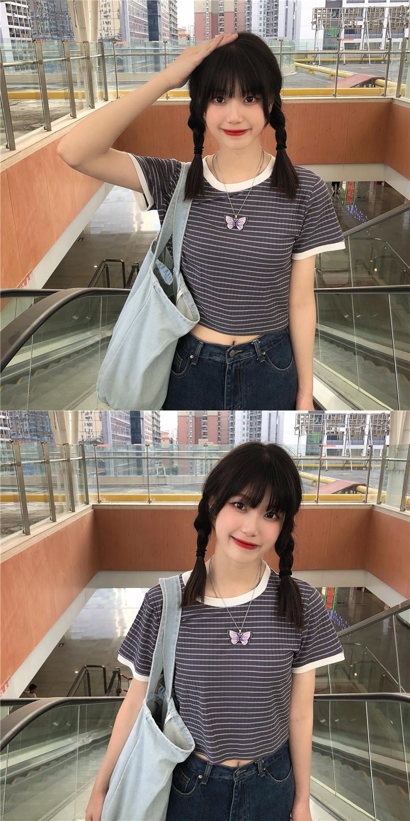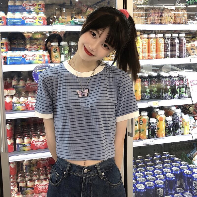 ✞ ストライプTシャツ シャツブラウスラウンドネックプルオーバー 半袖スリーブ♥カワイイ♥カラー ショート ✞ゴスロリ SM ミリ 甘ロリ クラロリ 和ロリ エレガント 黒ロリ 姫ロリ 華ロリ BB-BB5628055