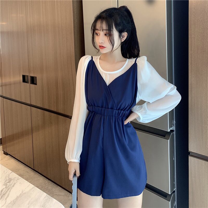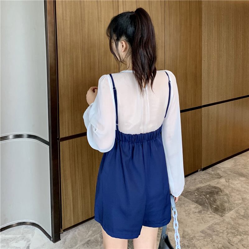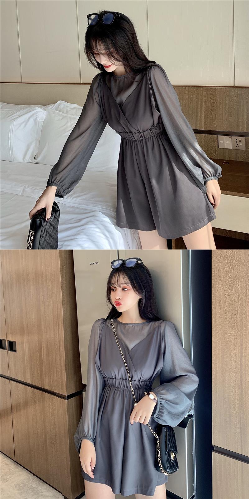 色:白いシフォンシャツ,グレーのシフォンシャツワンピース,青いジャンプスーツのワンピース,グレーのジャンプスーツワンピース