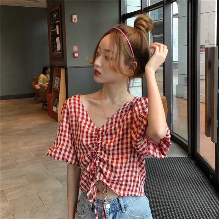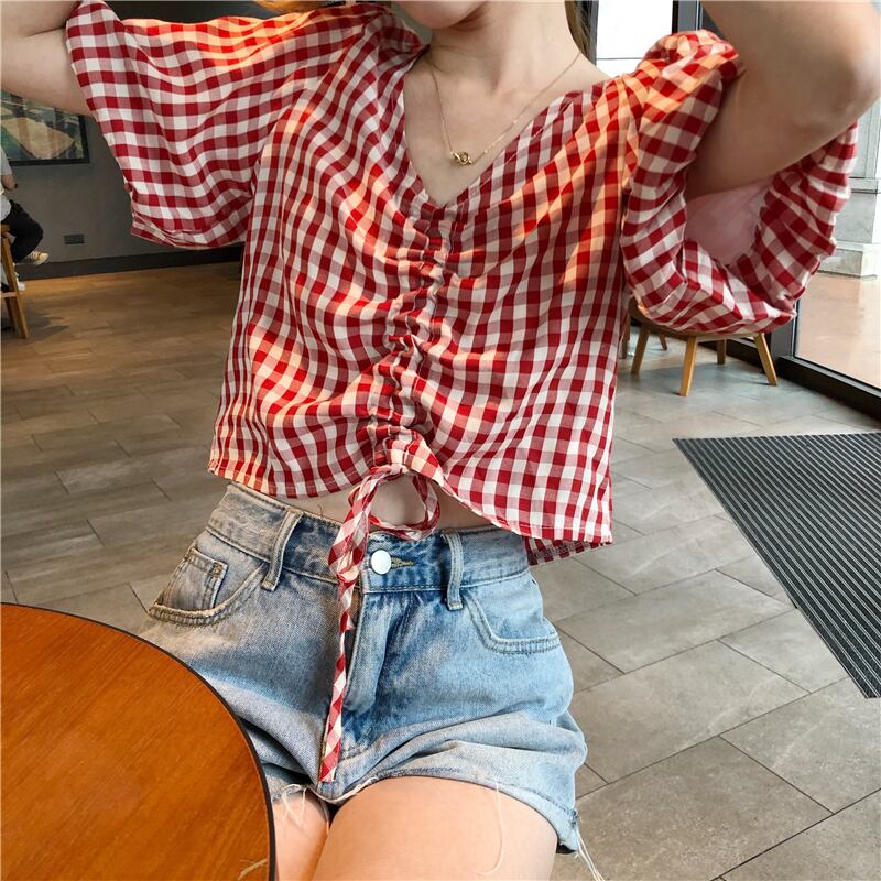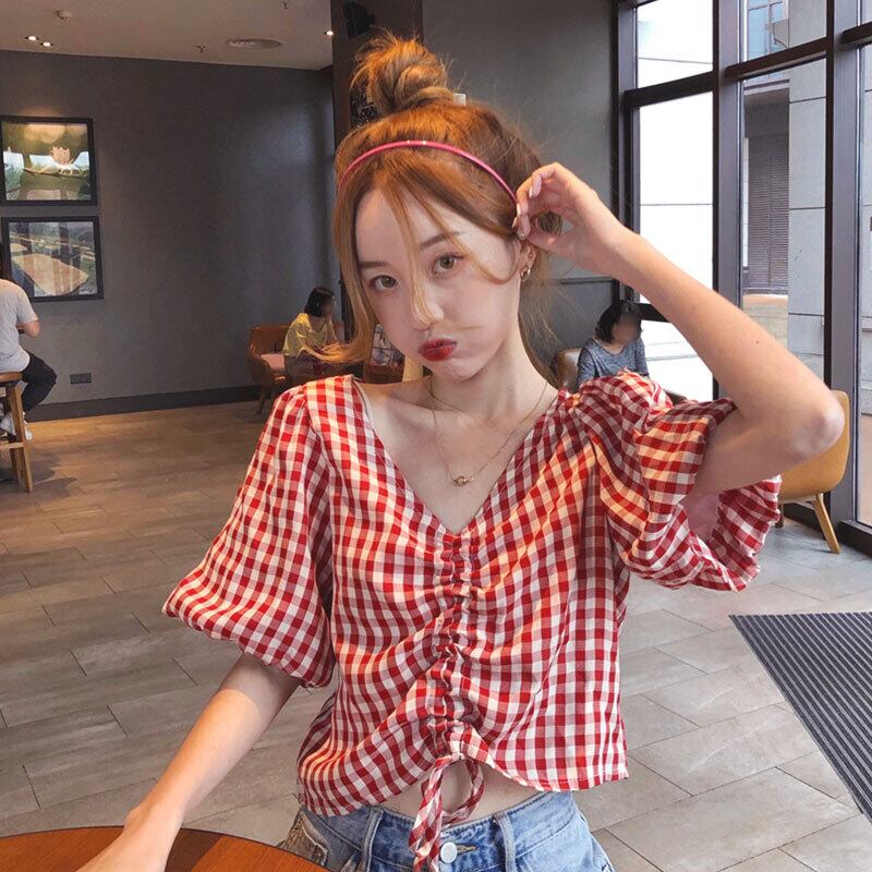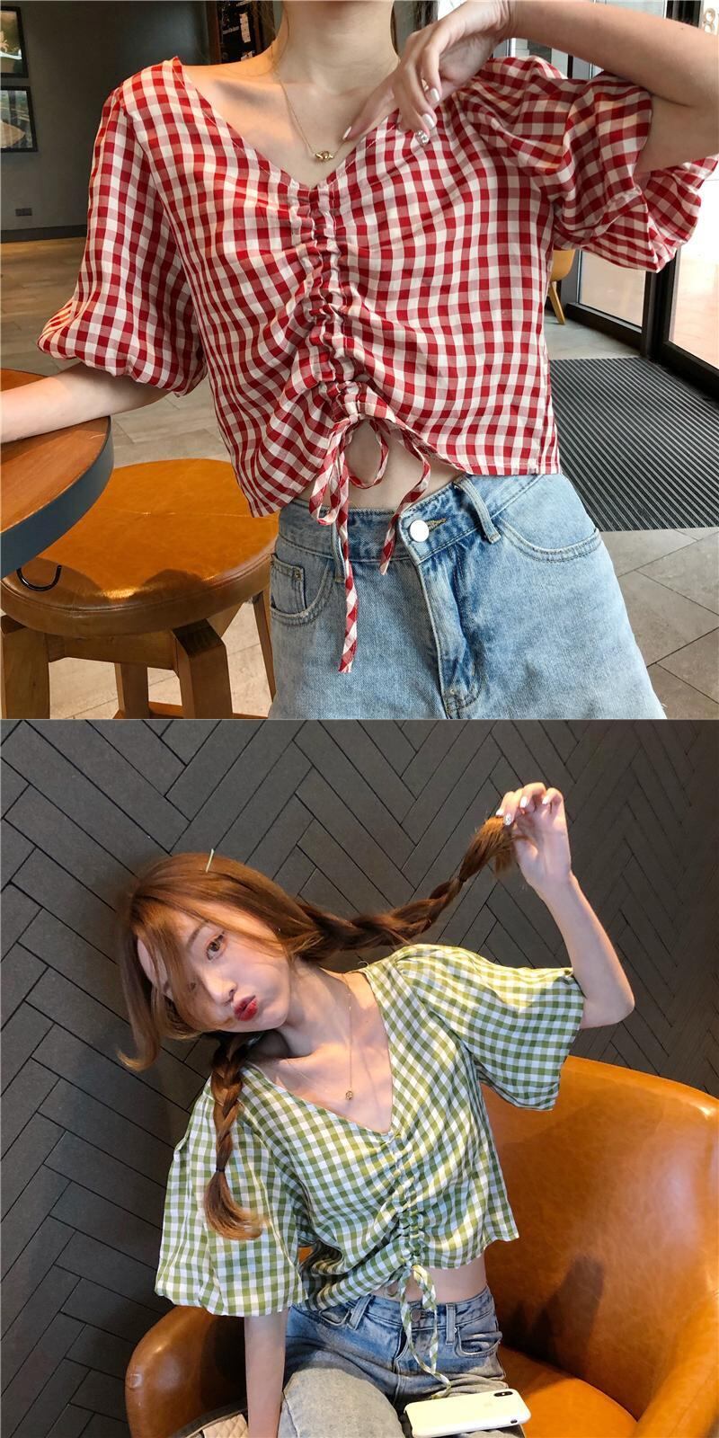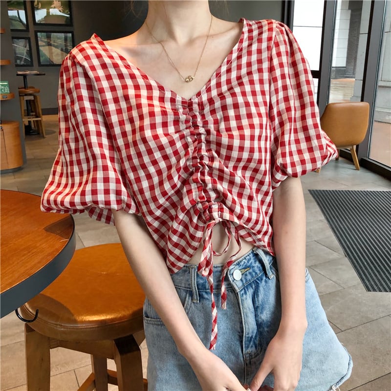 ✞ スタンダードチェック柄Vネックギャザーウエストすっきり☆着痩せショートシャツブラウス ランタンスリーブ レトロ ✞ゴスロリ SM ミリ 甘ロリ クラロリ 和ロリ エレガント 黒ロリ 姫ロリ 華ロリ BB-BB1386654