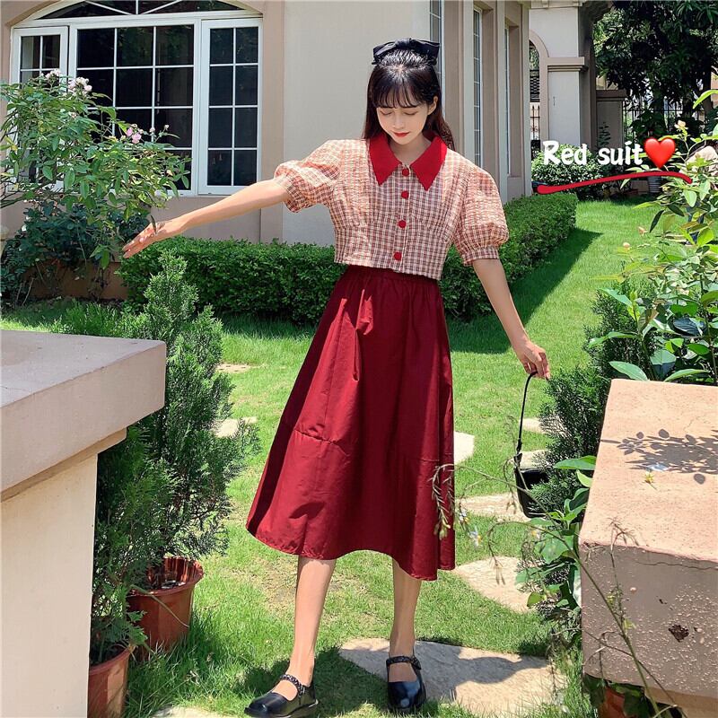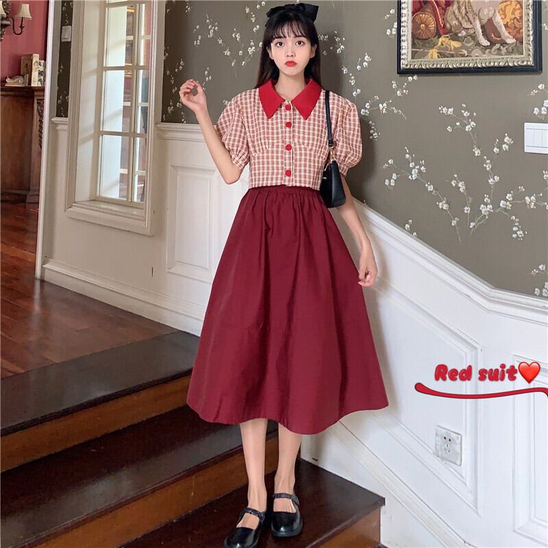 ✞ スリーブチェック柄ショートシャツブラウスストレッチウエストすっきり☆着痩せAラインスカート エラスティック 伸縮 ✞ゴスロリ SM ミリ 甘ロリ クラロリ 和ロリ エレガント 黒ロリ 姫ロリ 華ロリ BB-BB1373534