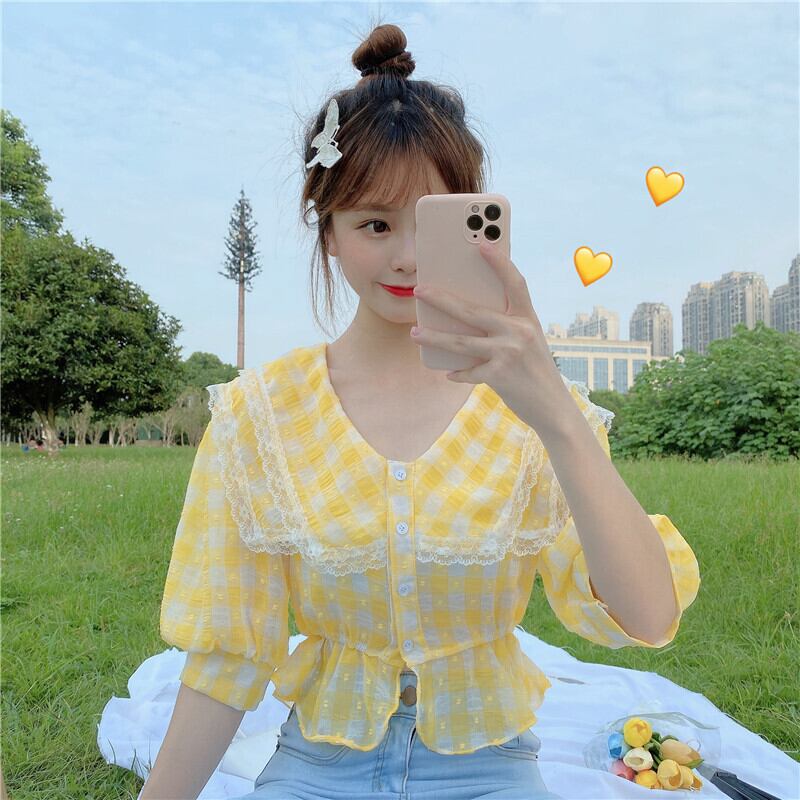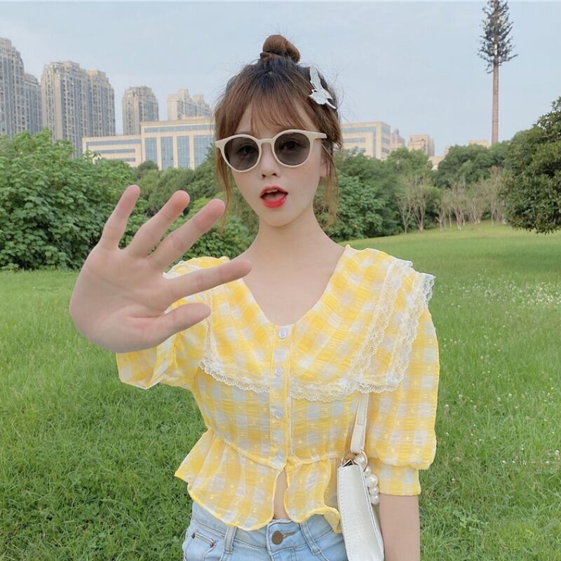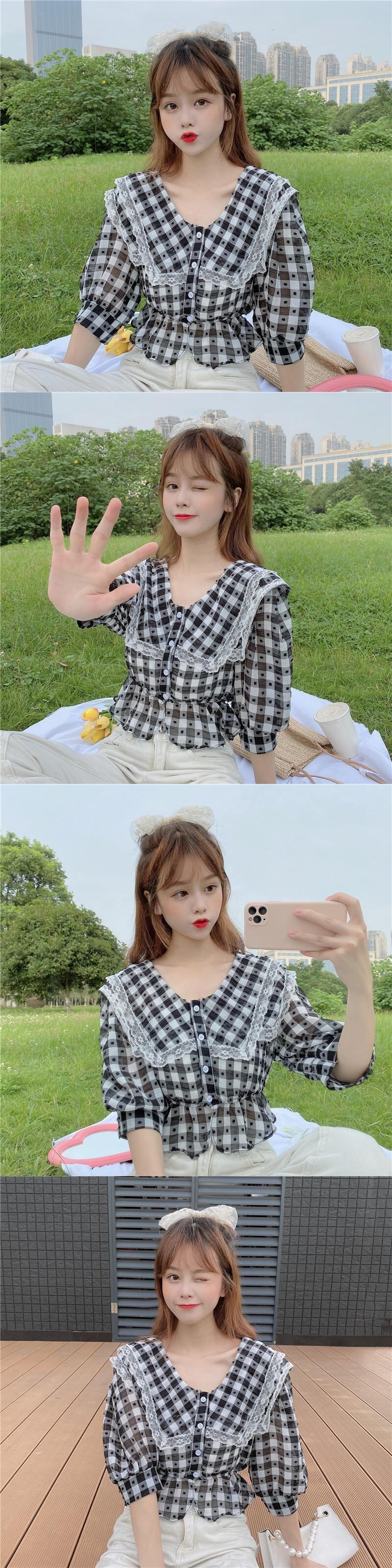 ✞ きれいめ☆スタンダードチェック柄レースウエストすっきり☆着痩せ半袖スリーブシャツブラウストップス ショート レトロ スウィート ステッチ ✞ゴスロリ SM ミリ 甘ロリ クラロリ 和ロリ エレガント 黒ロリ 姫ロリ 華ロリ BB-BB5047739