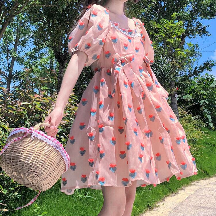 ✞ 花柄プリント柄リボンスリーブ♥カワイイ♥ スウィート フラワーデザイン スクウェア ステッチ ✞ゴスロリ SM ミリ 甘ロリ クラロリ 和ロリ エレガント 黒ロリ 姫ロリ 華ロリ BB-BB5036103