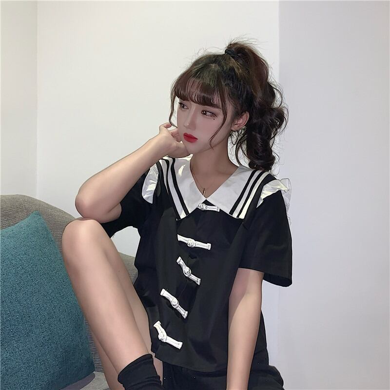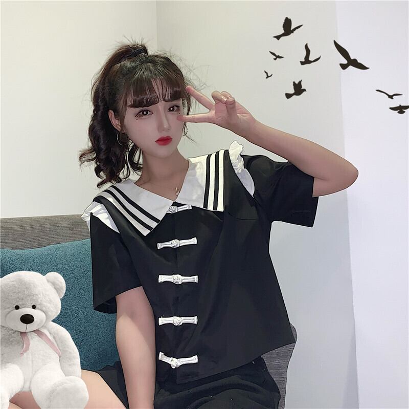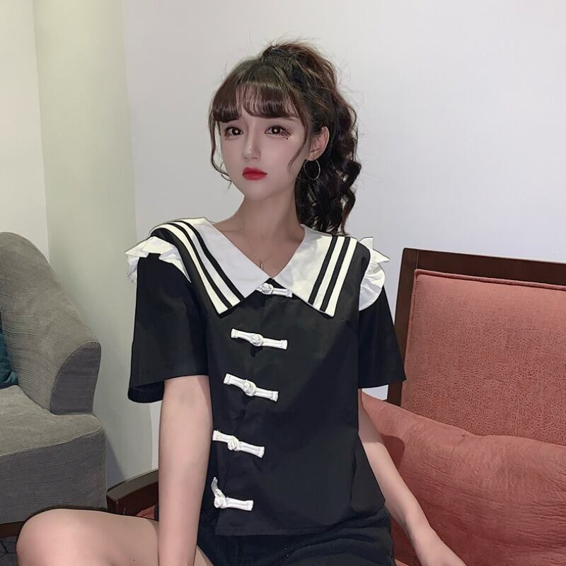 ✞ きれいめ☆ネイビースタンダードバックル半袖スリーブシャツブラウストップス ショート レトロ スウィート ✞ゴスロリ SM ミリ 甘ロリ クラロリ 和ロリ エレガント 黒ロリ 姫ロリ 華ロリ BB-BB5437271