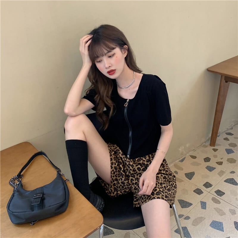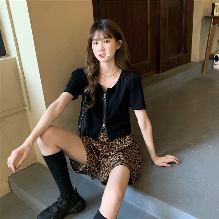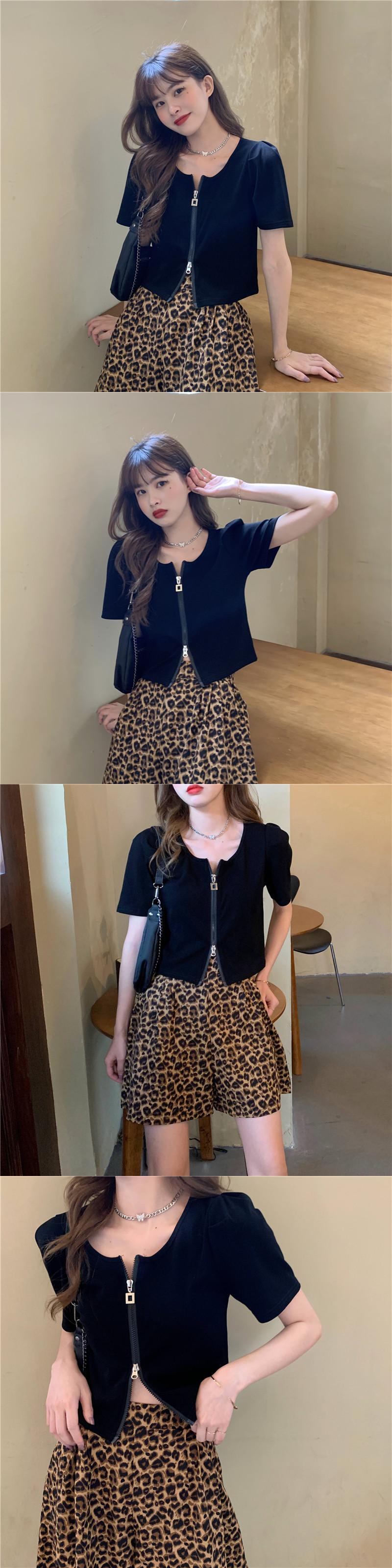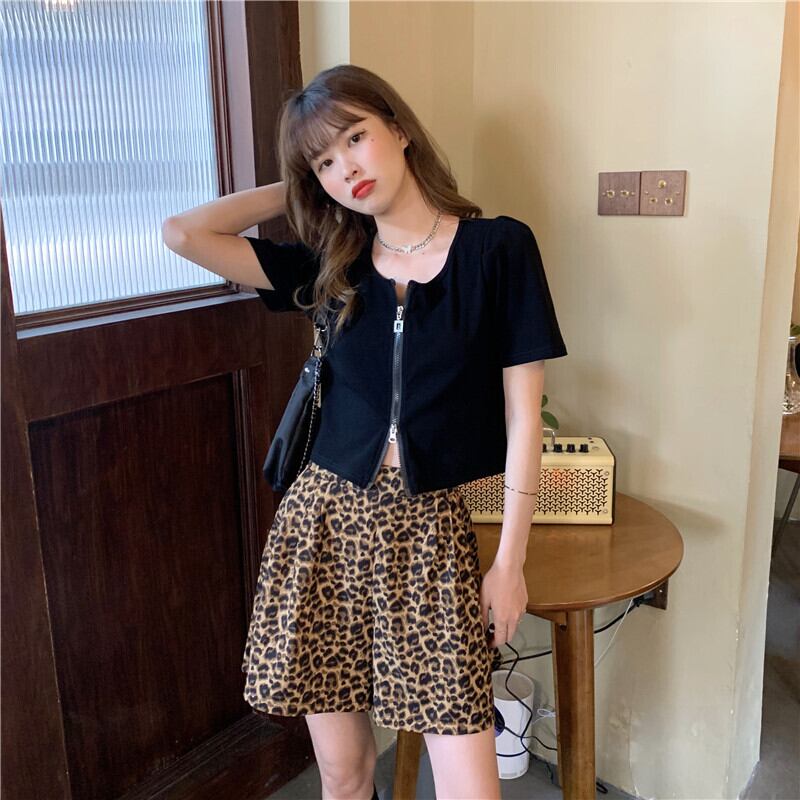 ✞ スタンダードラウンドネックスリムショートジッパーカーディガンカジュアルレオパードショートパンツ レトロ ✞ゴスロリ SM ミリ 甘ロリ クラロリ 和ロリ エレガント 黒ロリ 姫ロリ 華ロリ BB-BB2806499