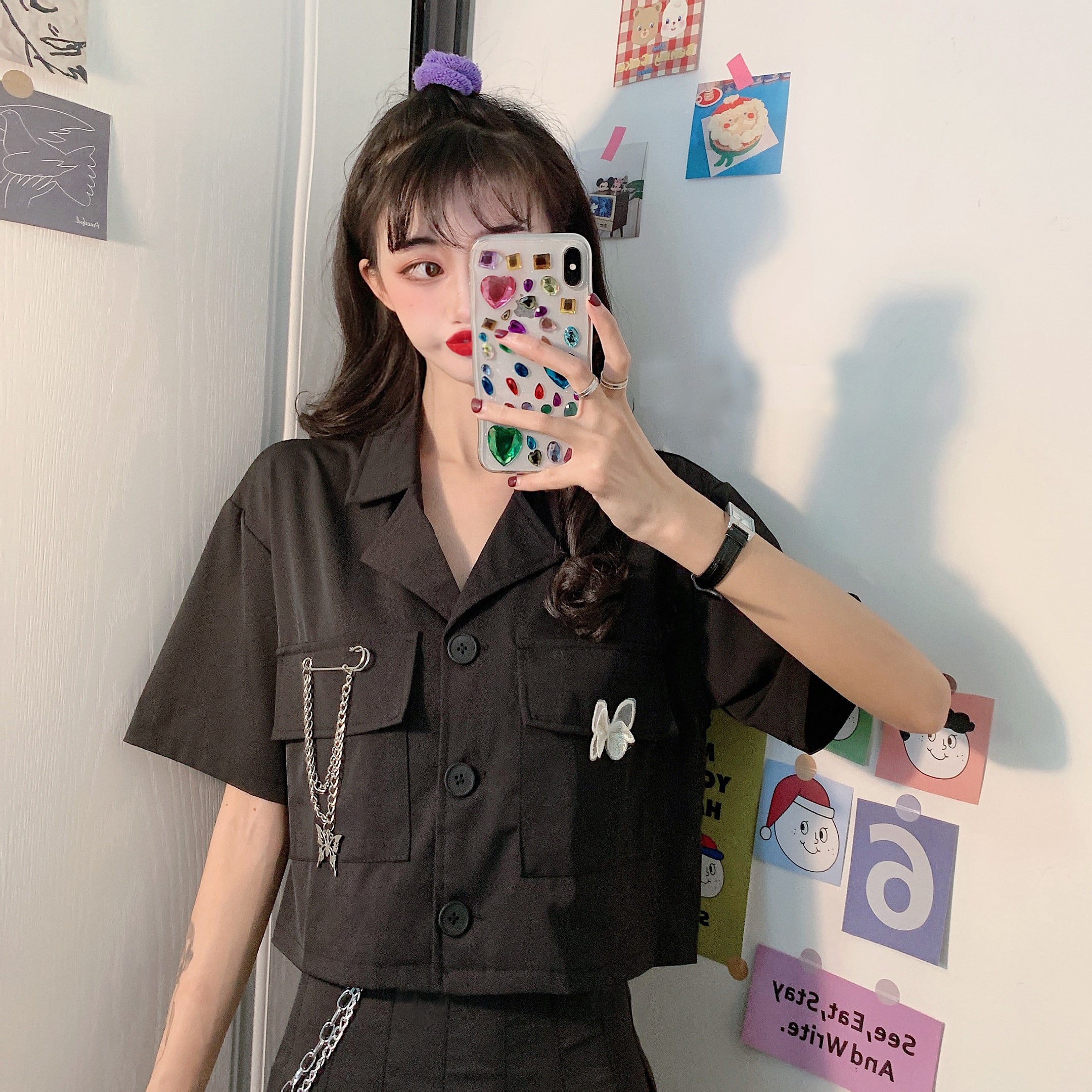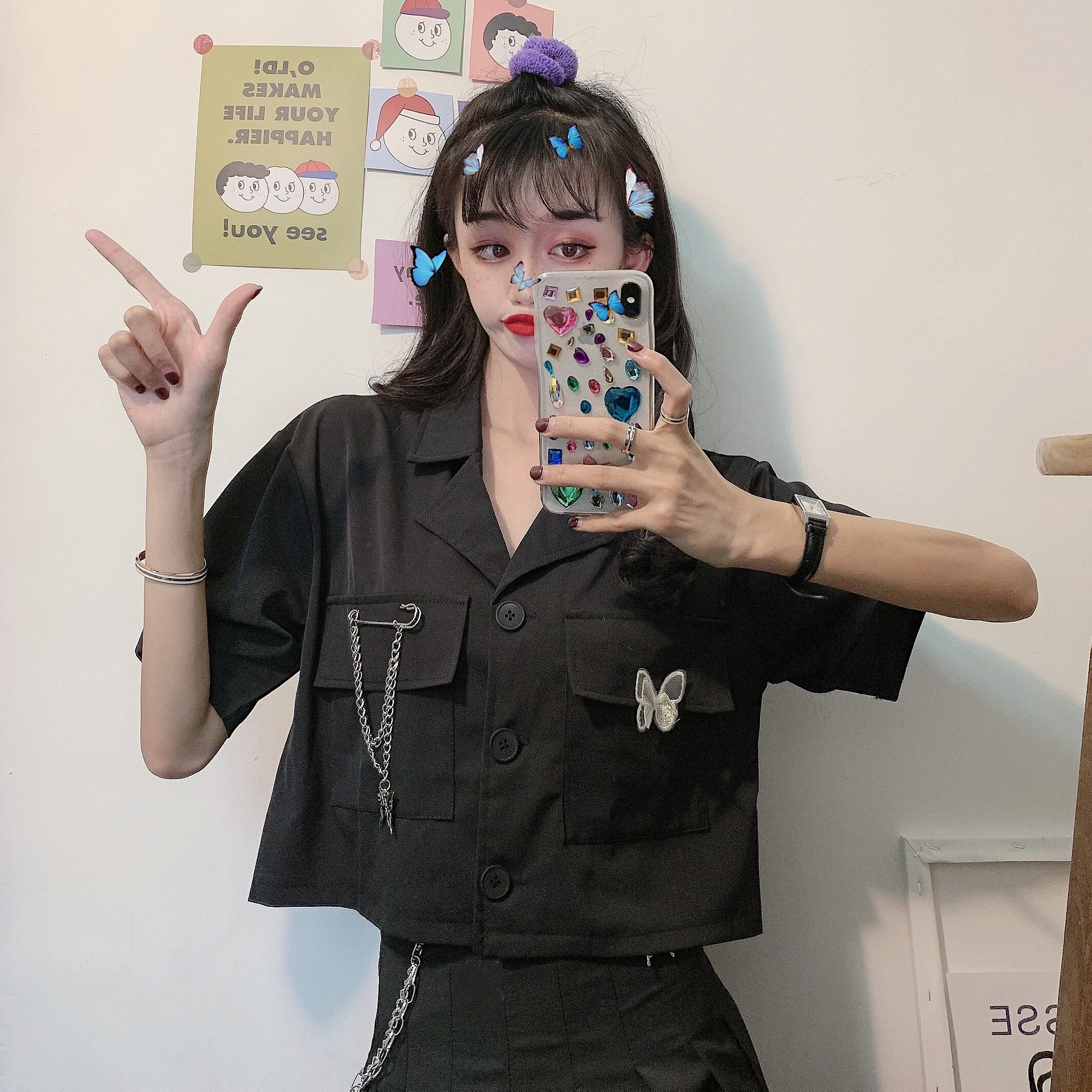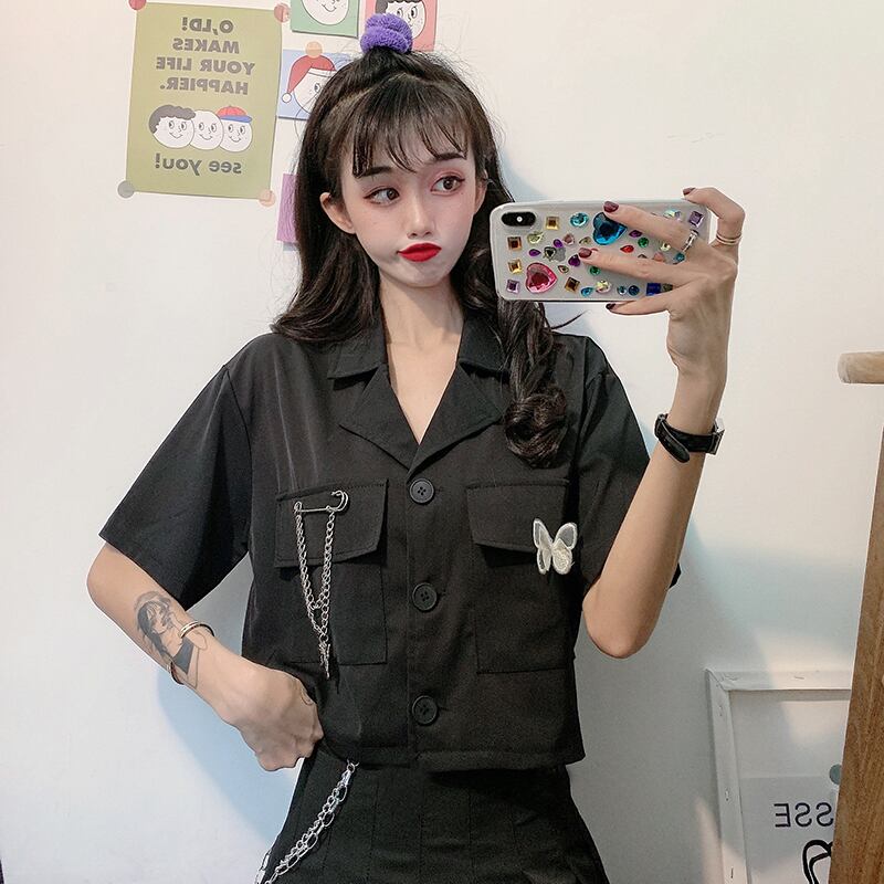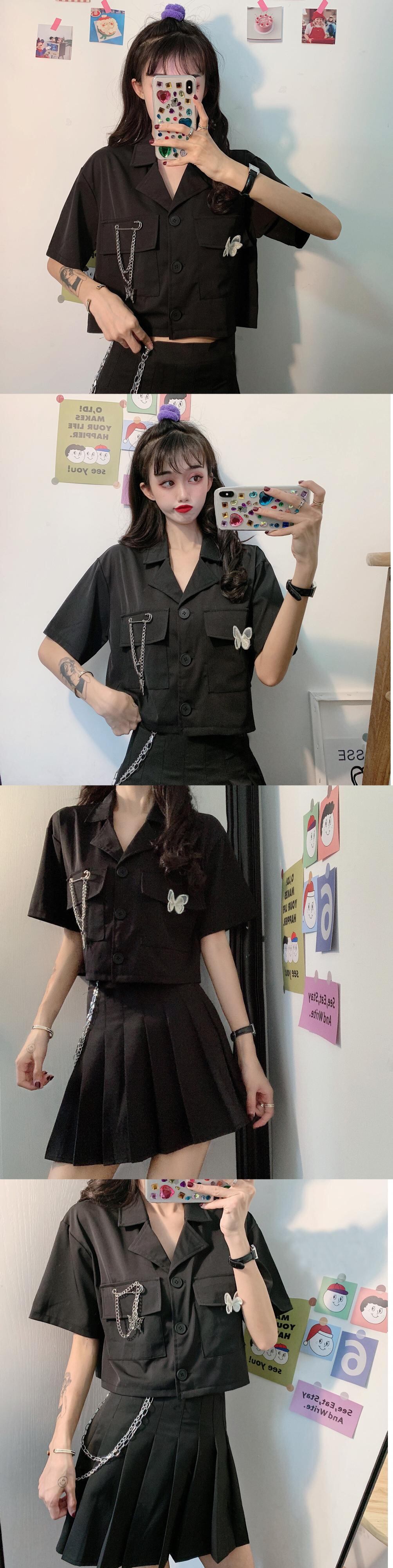 ✞ ダークポケットチェーン ショートButterflyデザイン シャツブラウス ✞ゴスロリ SM ミリ 甘ロリ クラロリ 和ロリ エレガント 黒ロリ 姫ロリ 華ロリ BB-BB6299569