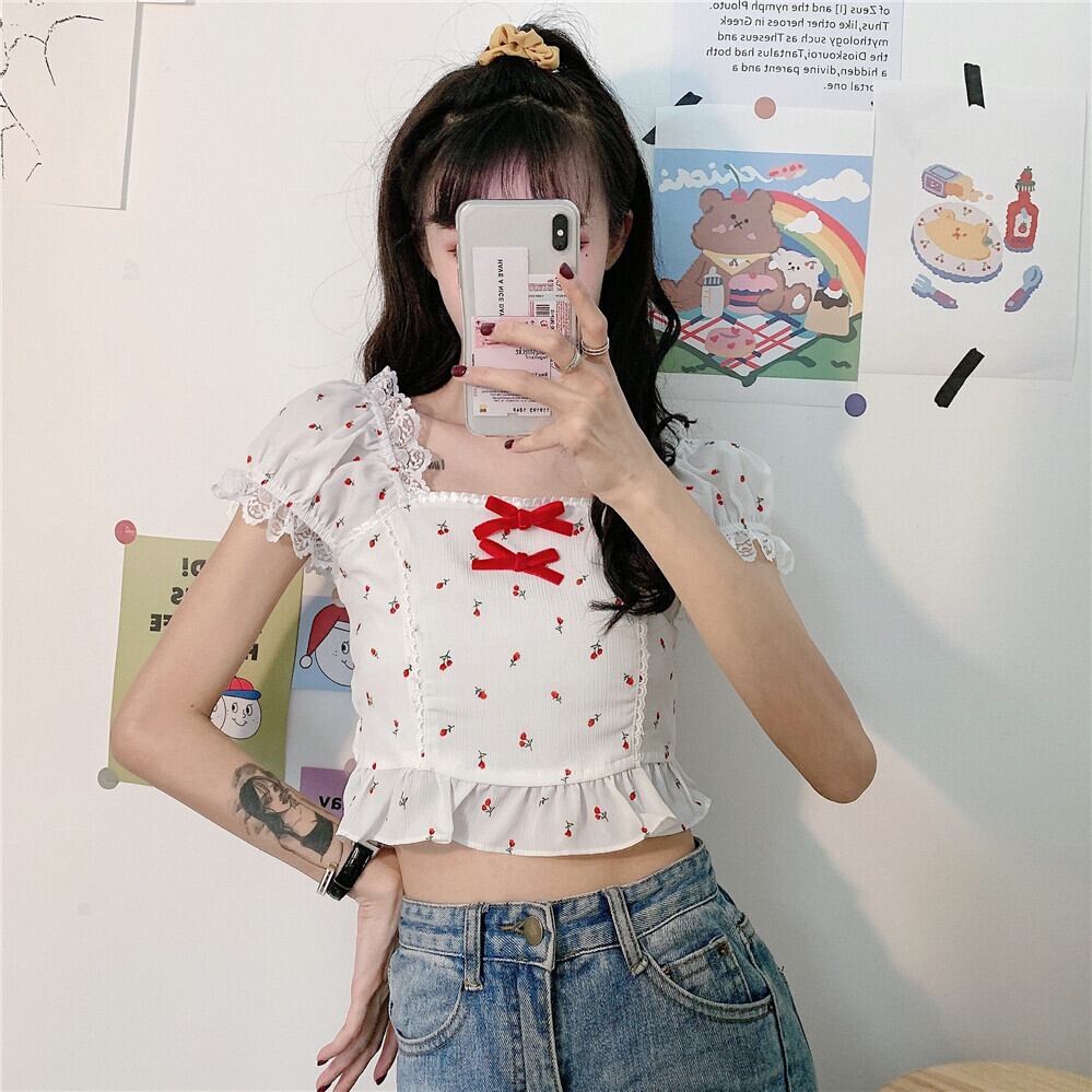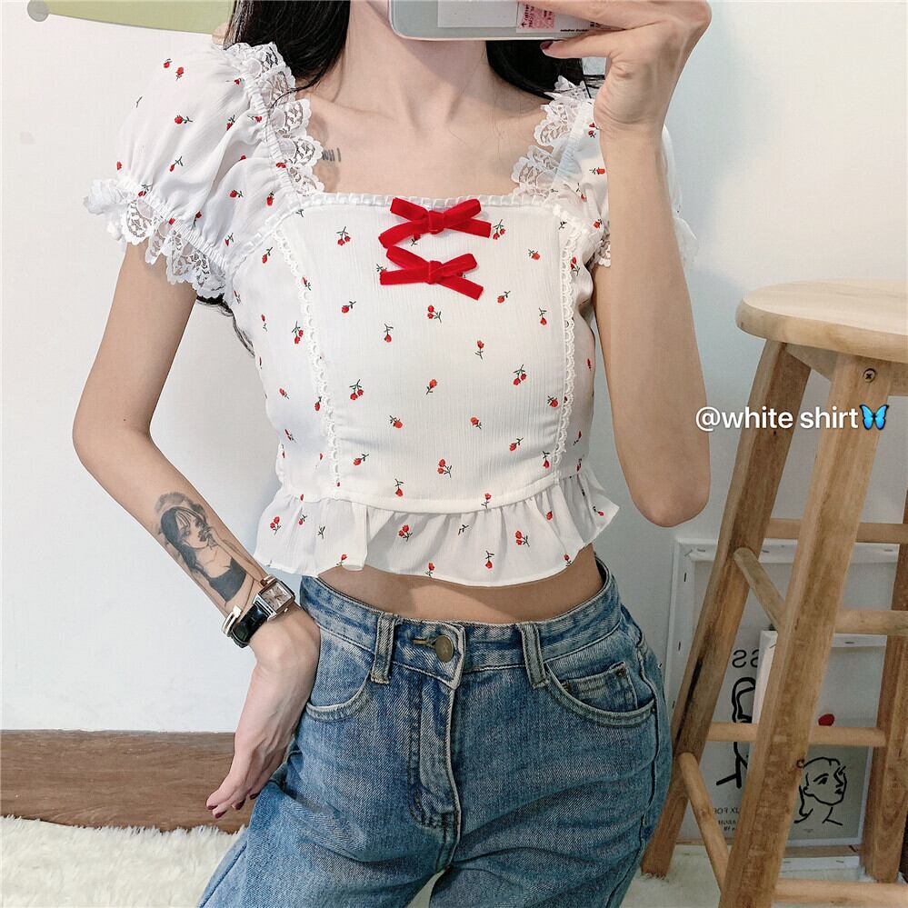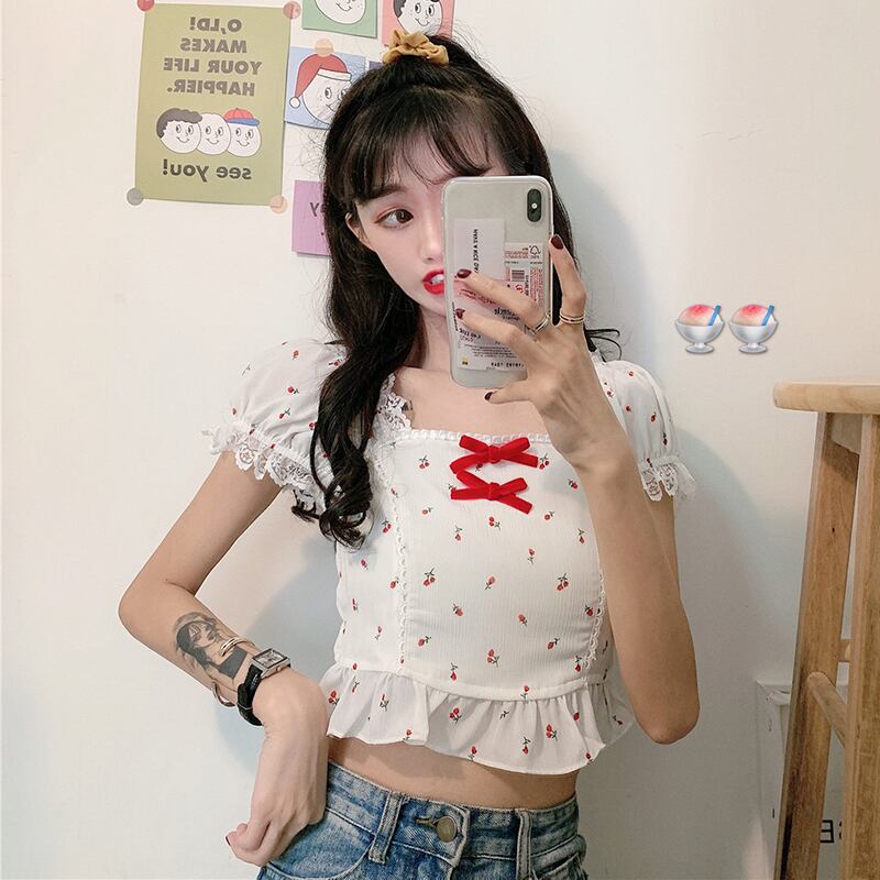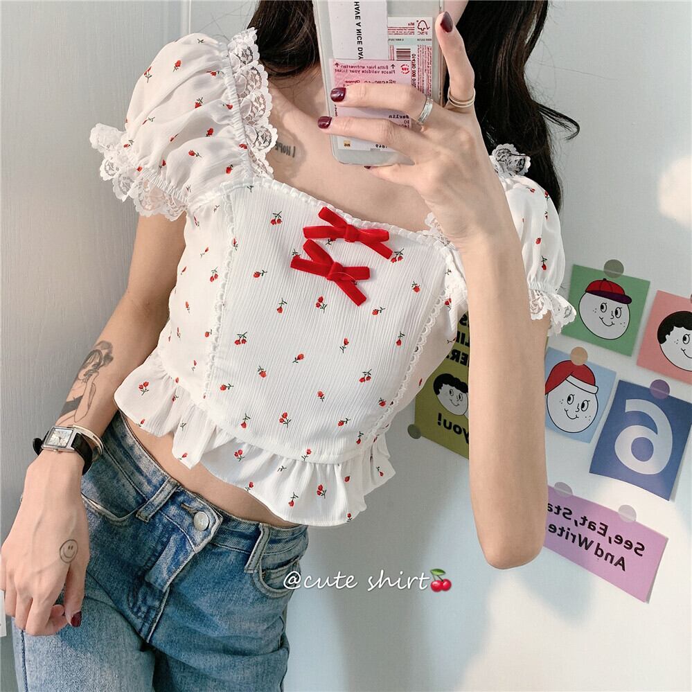 ✞ チェリー柄レースパフスリーブフリルりぼんシャツブラウス ☆サマー ショート スウィート 夏物 スクウェア ✞ゴスロリ SM ミリ 甘ロリ クラロリ 和ロリ エレガント 黒ロリ 姫ロリ 華ロリ BB-BB0623947