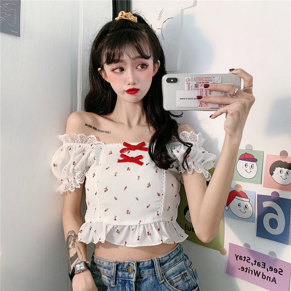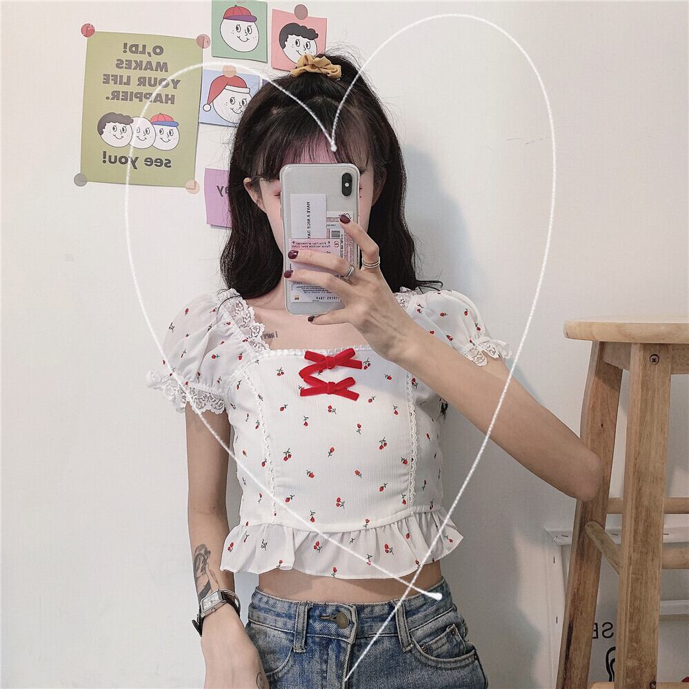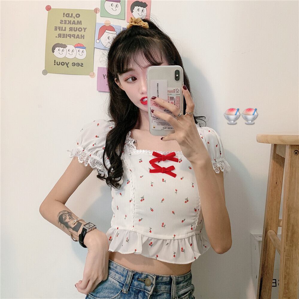 ✞ チェリー柄レースパフスリーブフリルりぼんシャツブラウス ☆サマー ショート スウィート 夏物 スクウェア ✞ゴスロリ SM ミリ 甘ロリ クラロリ 和ロリ エレガント 黒ロリ 姫ロリ 華ロリ BB-BB0623947