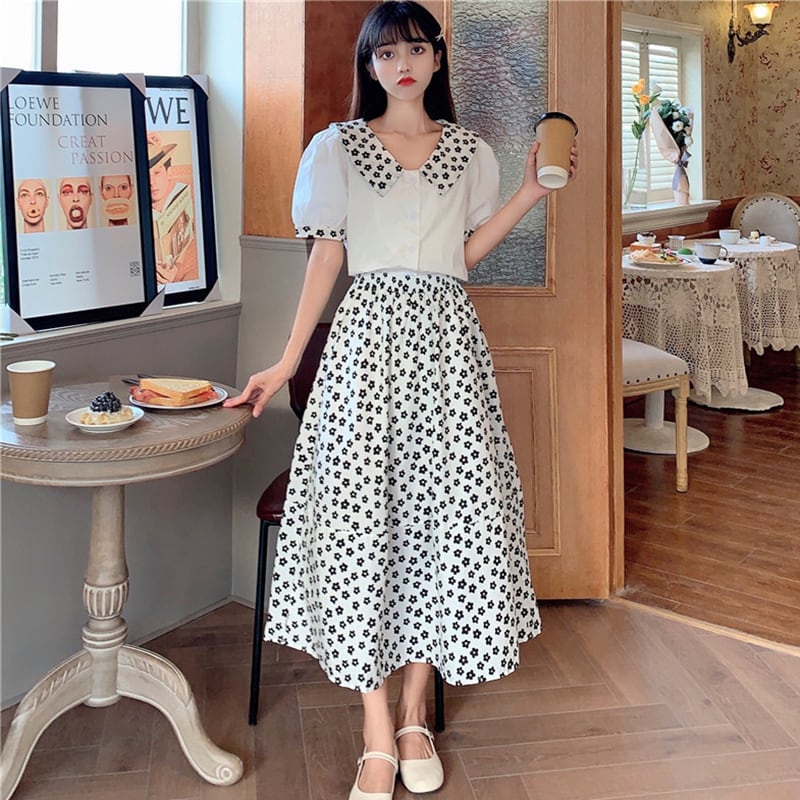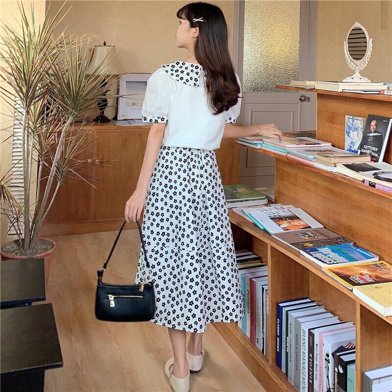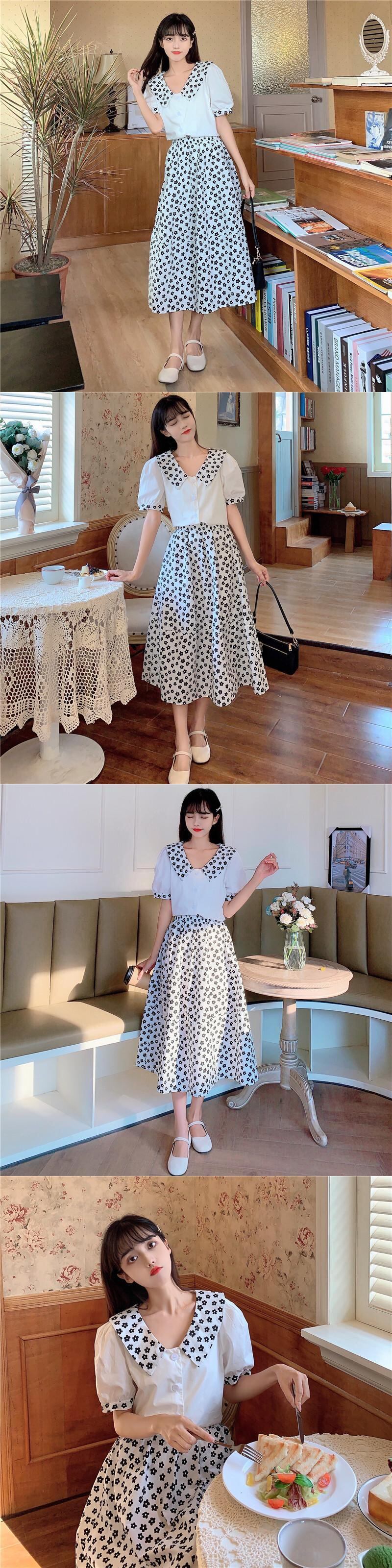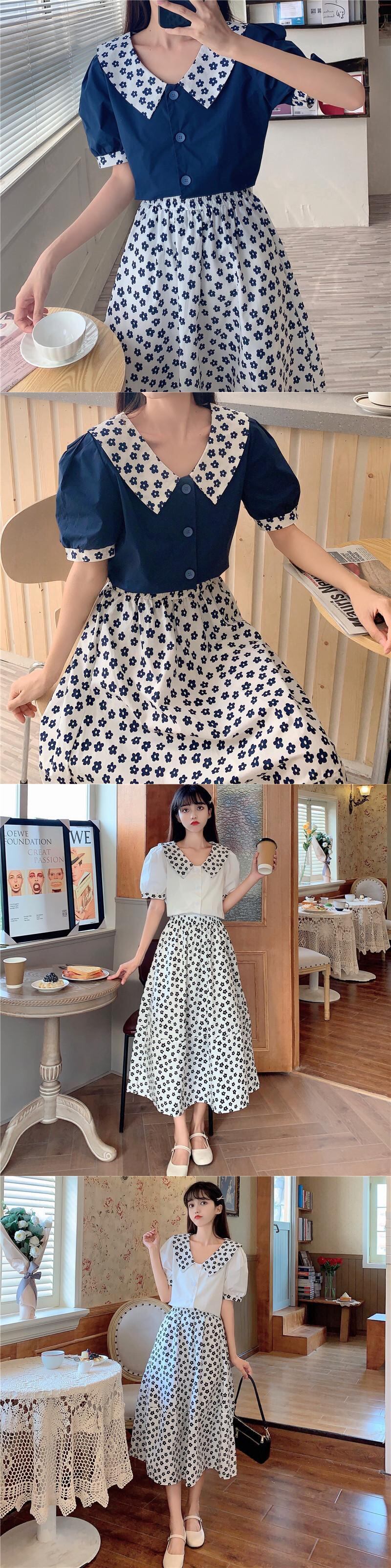 色:ブルートップワンピース,ホワイトトップ,ブルーフラワースカートワンピース,ブラックフラワースカートワンピース