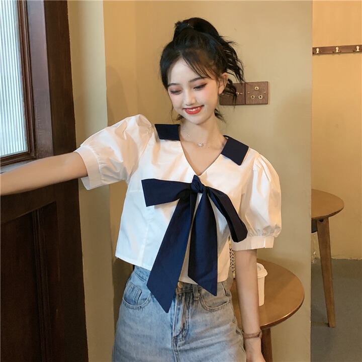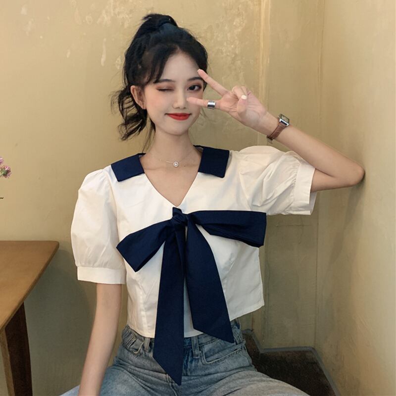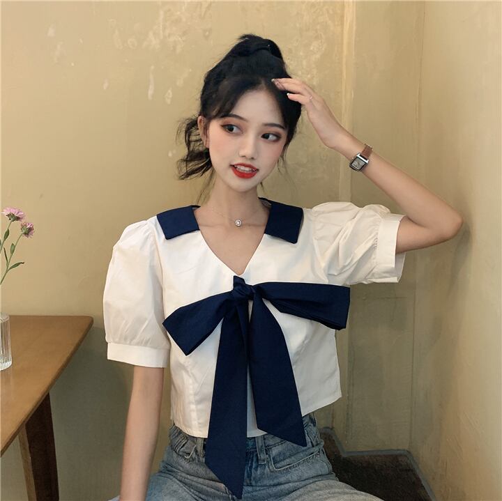 ✞ スリーブシャツブラウスきれいめ☆リボンレースカラーVネックショートトップス スウィート ✞ゴスロリ SM ミリ 甘ロリ クラロリ 和ロリ エレガント 黒ロリ 姫ロリ 華ロリ BB-BB7332074