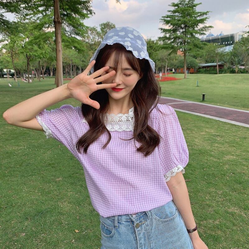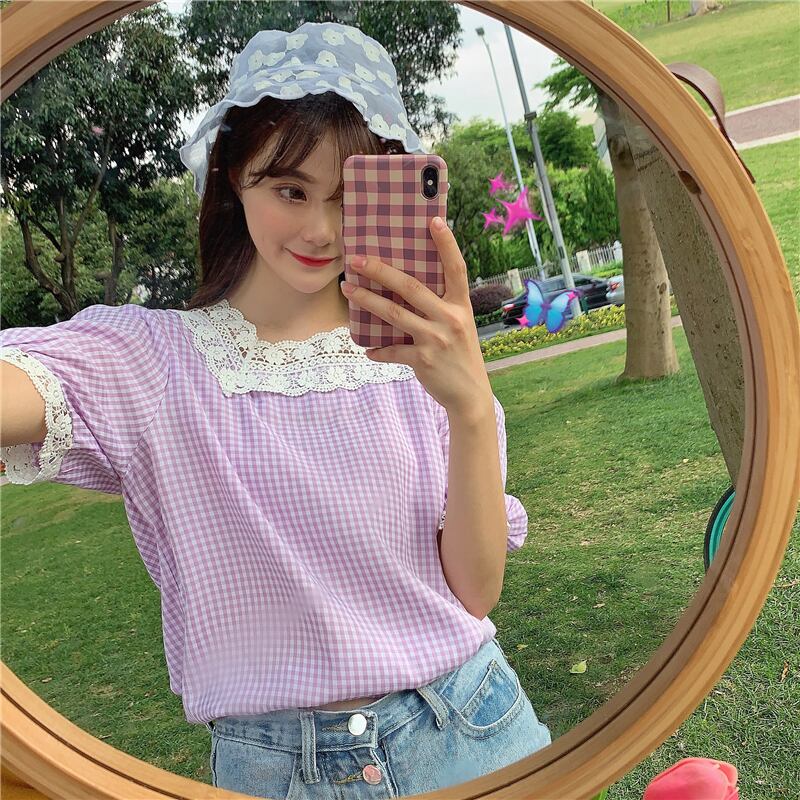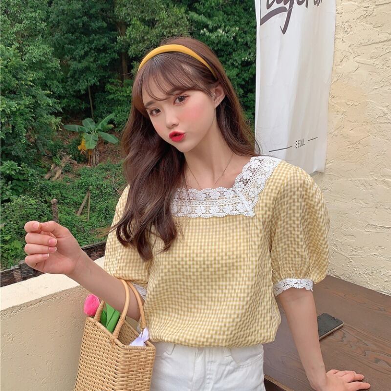 ✞ スタンダードレース♥カワイイ♥チェック柄スリーブシャツブラウストップス レトロ スウィート スクウェア ステッチ ✞ゴスロリ SM ミリ 甘ロリ クラロリ 和ロリ エレガント 黒ロリ 姫ロリ 華ロリ BB-BB6736407