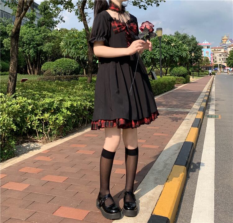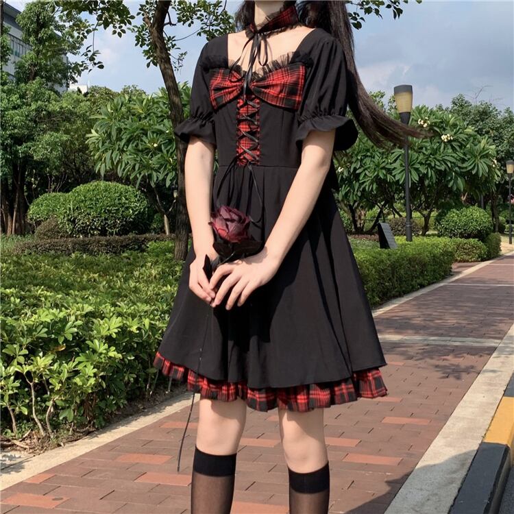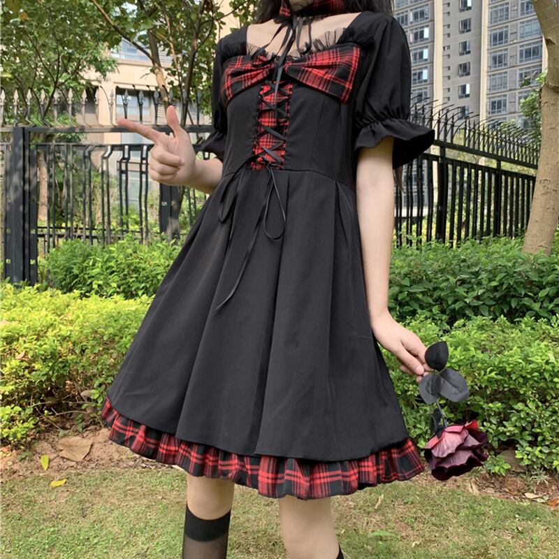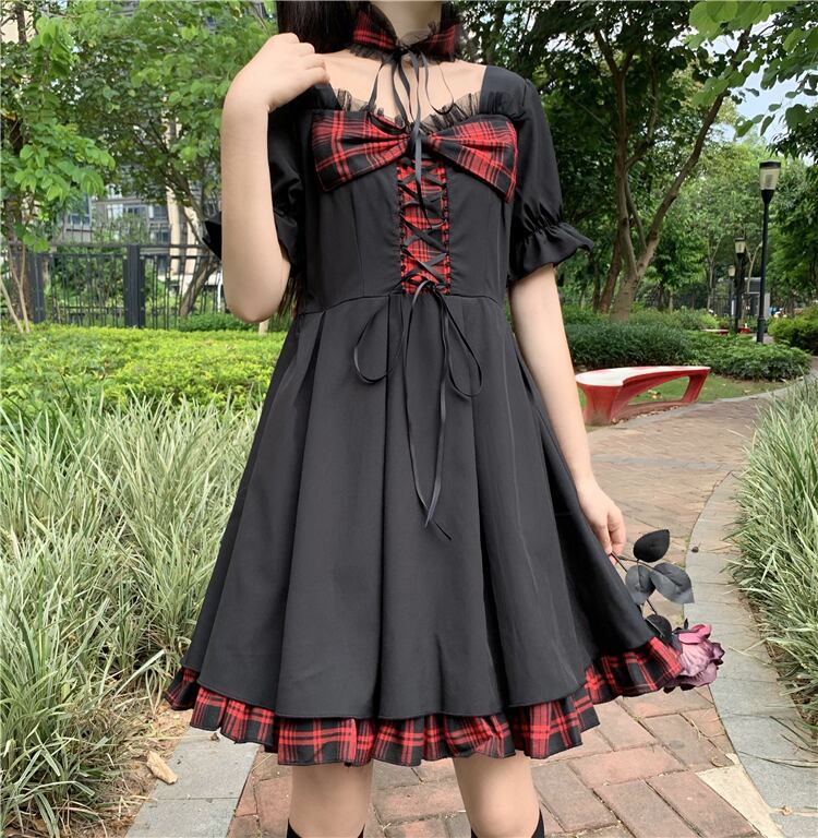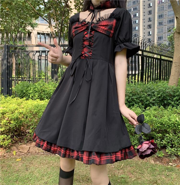 ✞ ダークブラックチェック柄リボンストラップ ウエストすっきり☆着痩せ半袖スリーブ ショート スウィート スクウェア ✞ゴスロリ SM ミリ 甘ロリ クラロリ 和ロリ エレガント 黒ロリ 姫ロリ 華ロリ BB-BB6103105