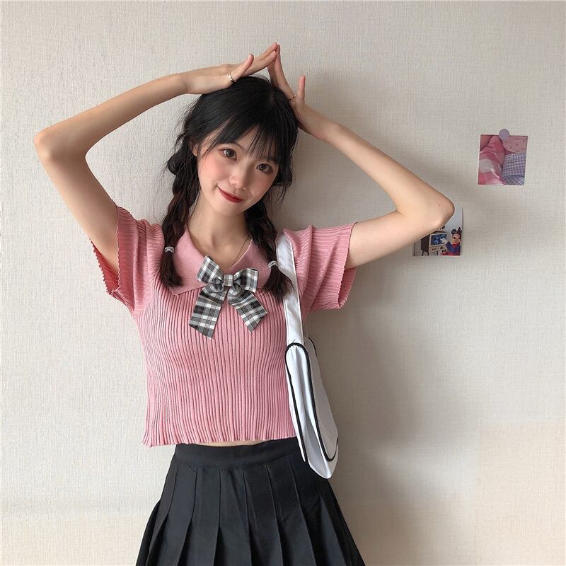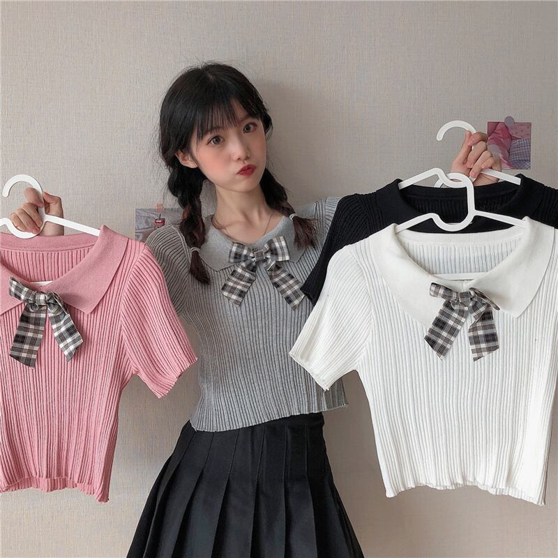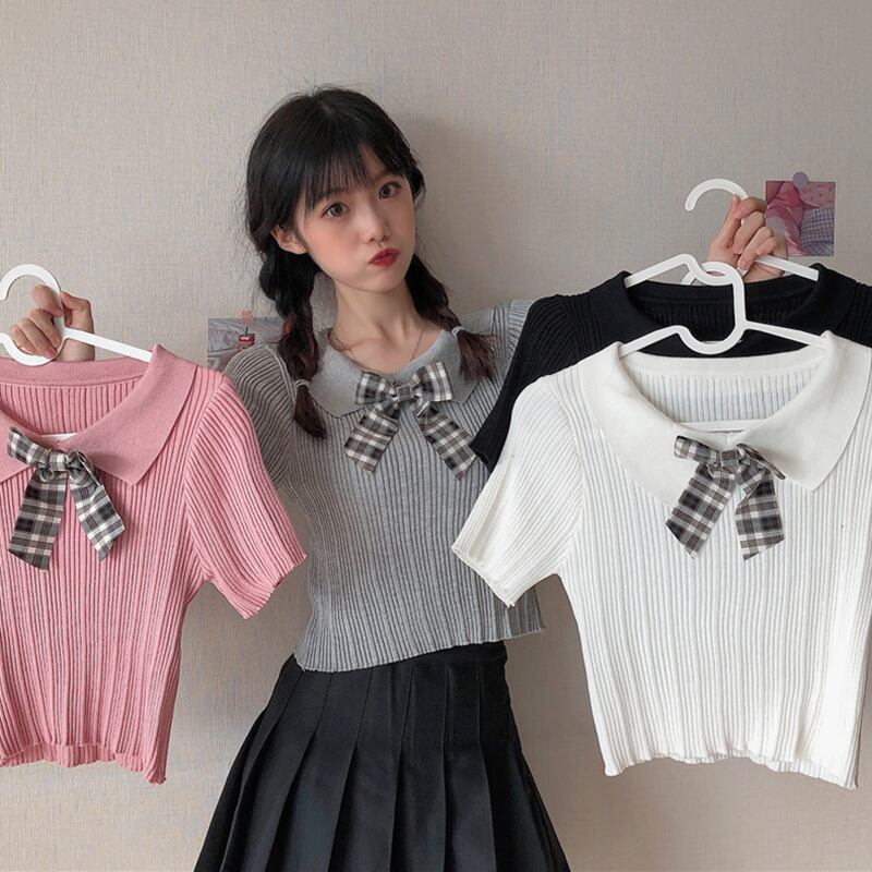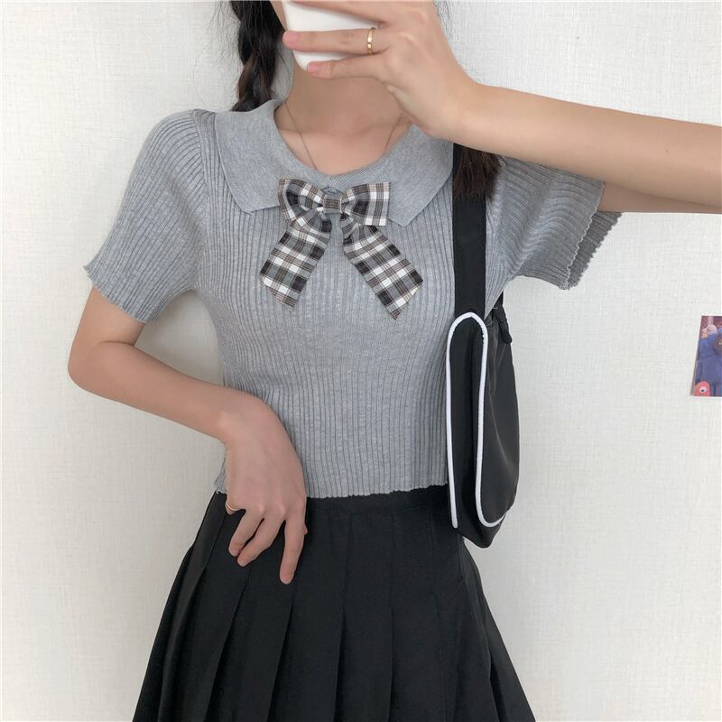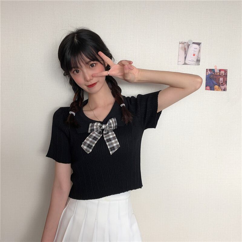 ✞ サマーきれいめ☆スリムチェック柄リボンニットショートTシャツ 大人女子☆ スウィート 夏物 ✞ゴスロリ SM ミリ 甘ロリ クラロリ 和ロリ エレガント 黒ロリ 姫ロリ 華ロリ BB-BB5433650
