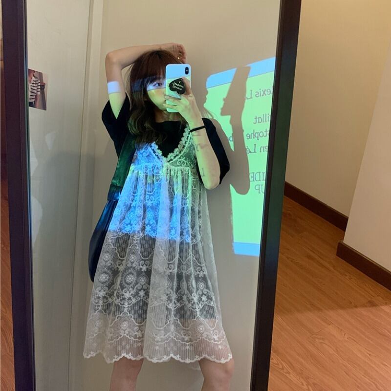 ✞ ♥カワイイ♥ブラックラウンドネック半袖スリーブVネックレースメッシュスカート ショート スウィート ✞ゴスロリ SM ミリ 甘ロリ クラロリ 和ロリ エレガント 黒ロリ 姫ロリ 華ロリ BB-BB0216185
