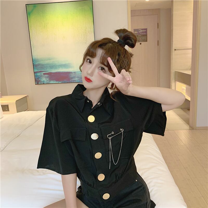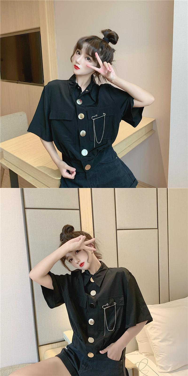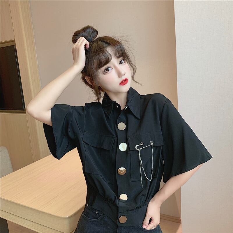 ✞ スタンダードダークブラック半袖スリーブメタルバックルポケットシャツブラウス ショート レトロ ✞ゴスロリ SM ミリ 甘ロリ クラロリ 和ロリ エレガント 黒ロリ 姫ロリ 華ロリ BB-BB1243790