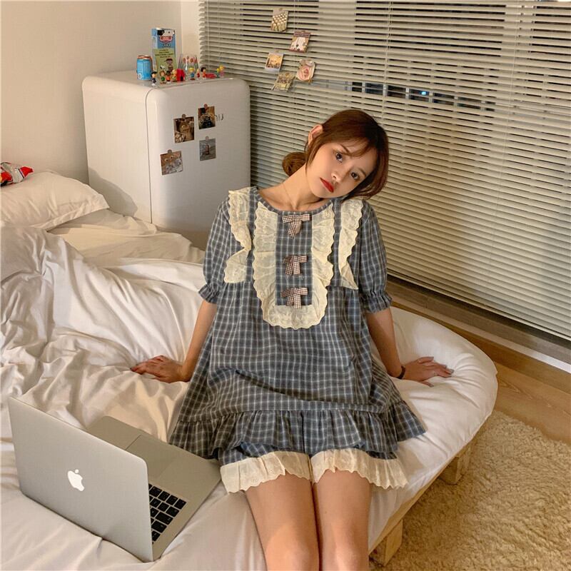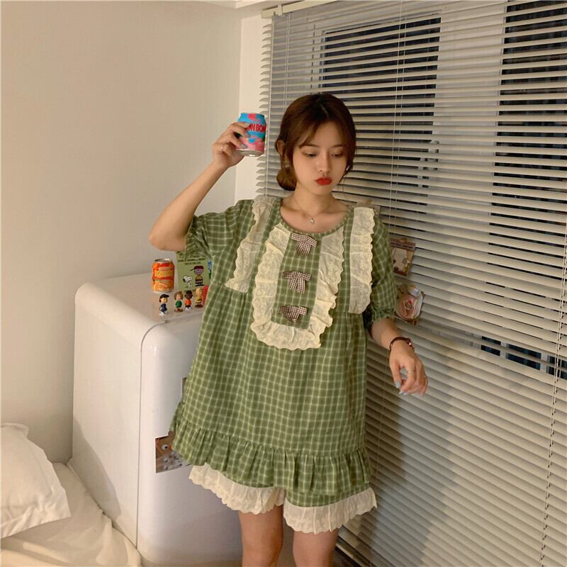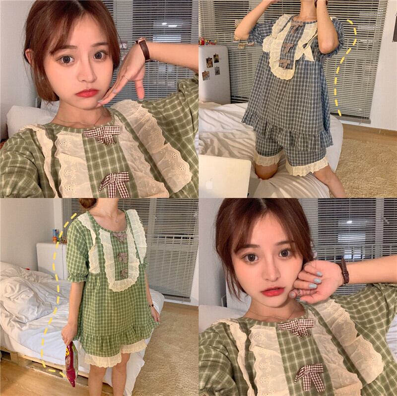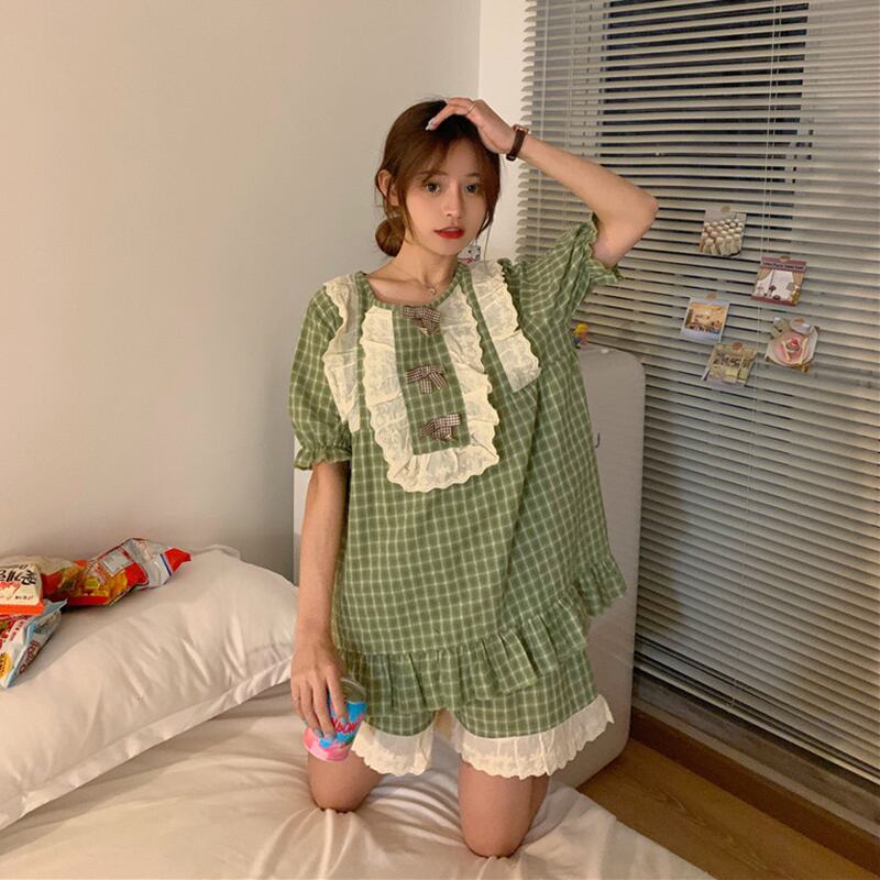 ✞ レースサイド半袖スリーブショートパンツチェック柄 スウィート ✞ゴスロリ SM ミリ 甘ロリ クラロリ 和ロリ エレガント 黒ロリ 姫ロリ 華ロリ BB-BB1605378