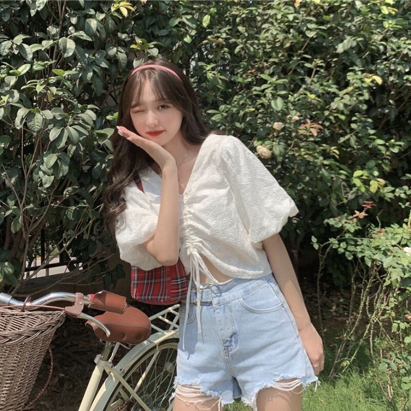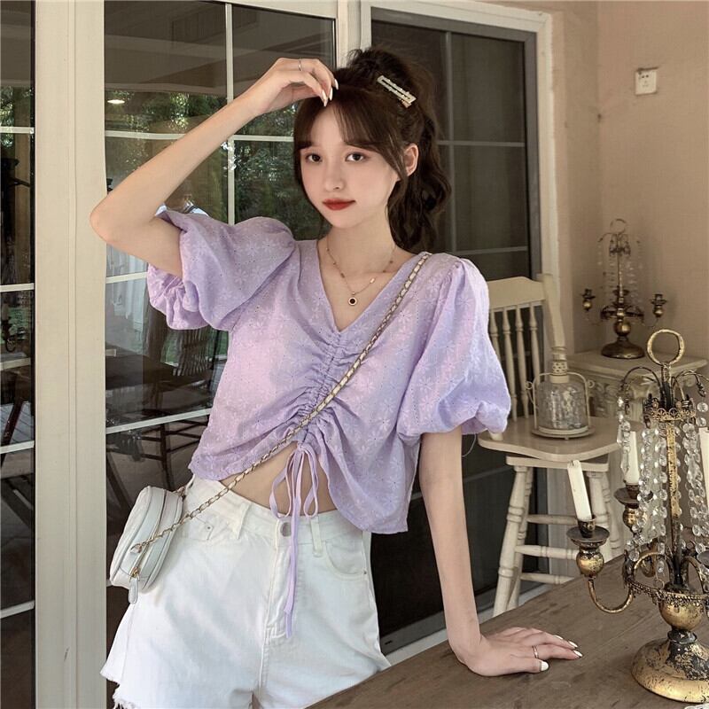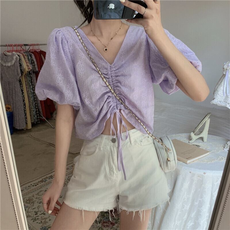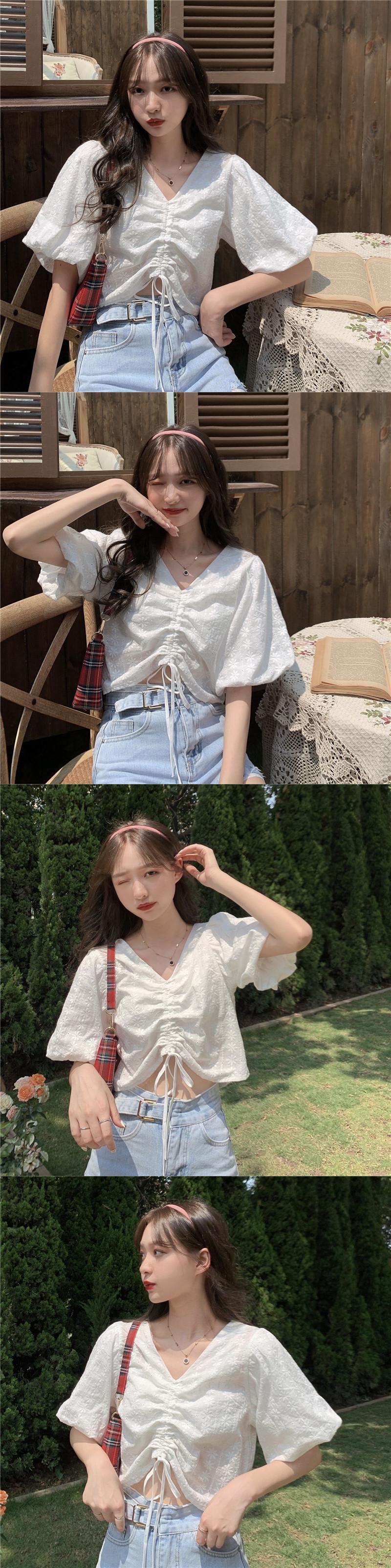 ✞ ギャザーウエストすっきり☆着痩せVネック花柄スリーブショートシャツブラウス ランタンスリーブ スウィート フラワーデザイン ✞ゴスロリ SM ミリ 甘ロリ クラロリ 和ロリ エレガント 黒ロリ 姫ロリ 華ロリ BB-BB4819908