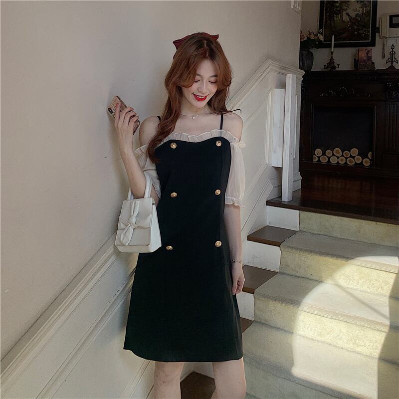 ✞ 黒ダブルブレストストラップレスワンピースドレスOP ☆着痩せスリーブ ✞ゴスロリ SM ミリ 甘ロリ クラロリ 和ロリ エレガント 黒ロリ 姫ロリ 華ロリ BB-BB4343793