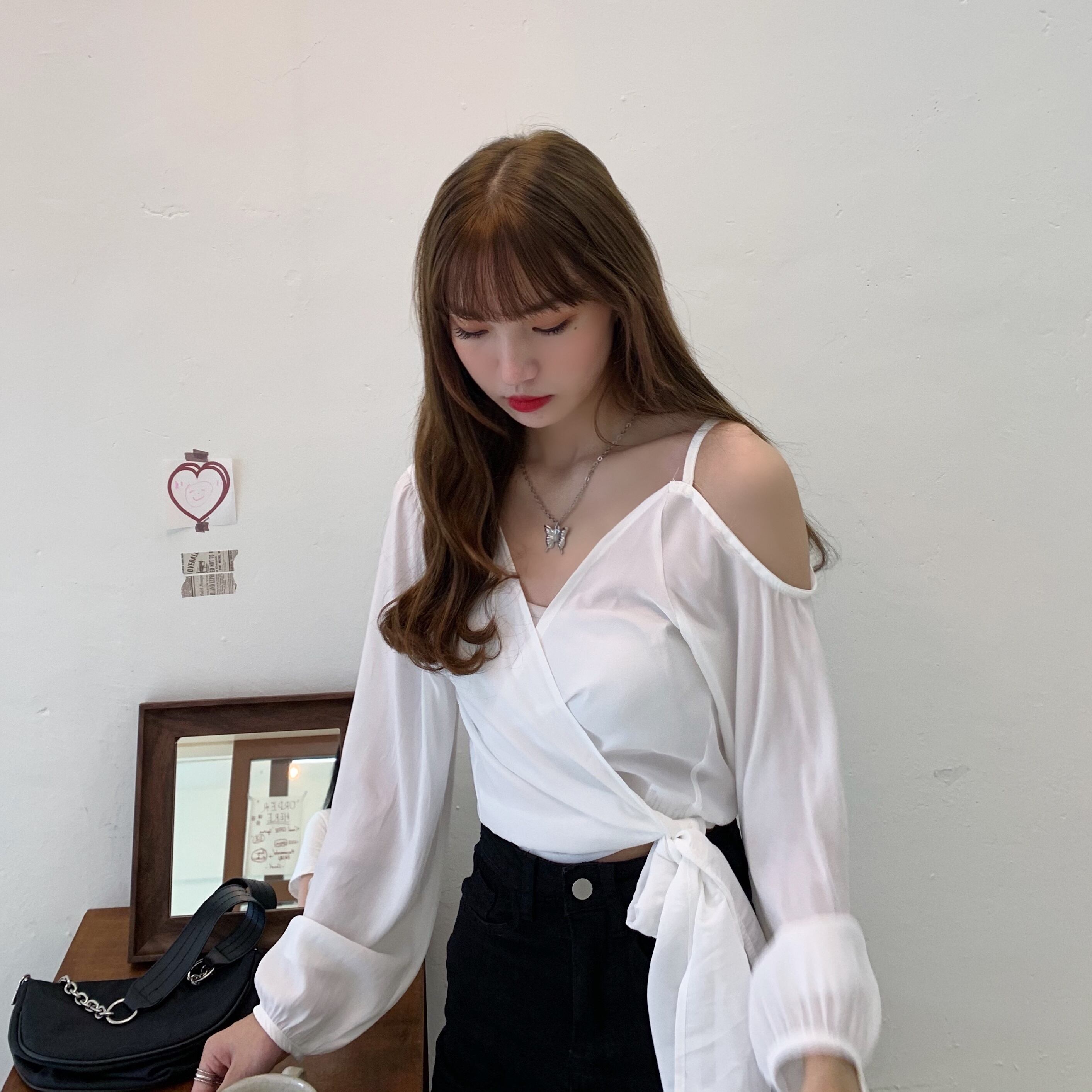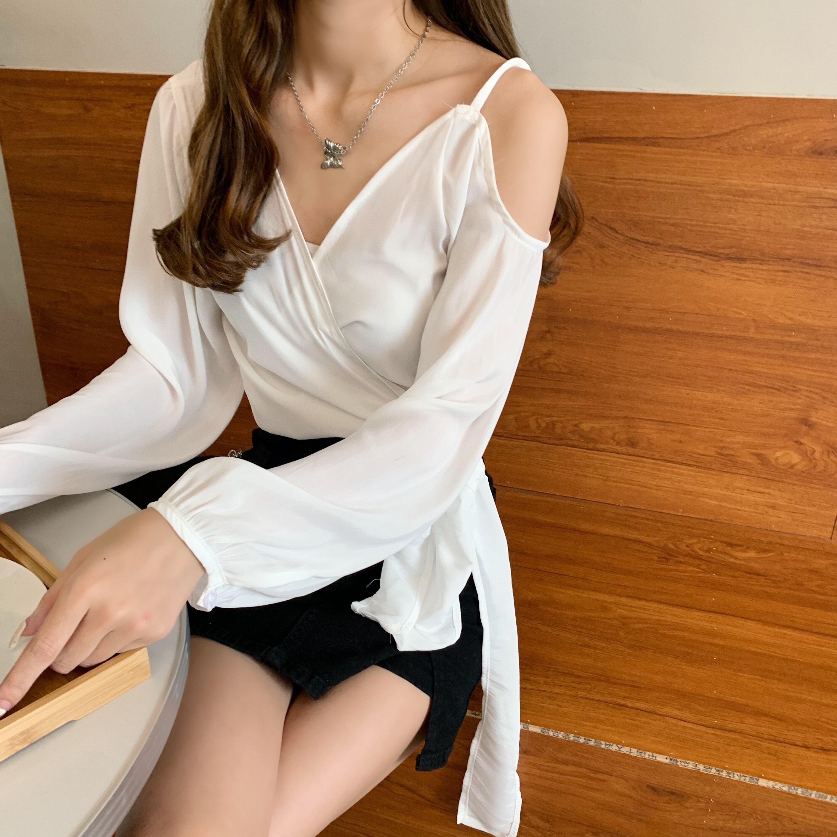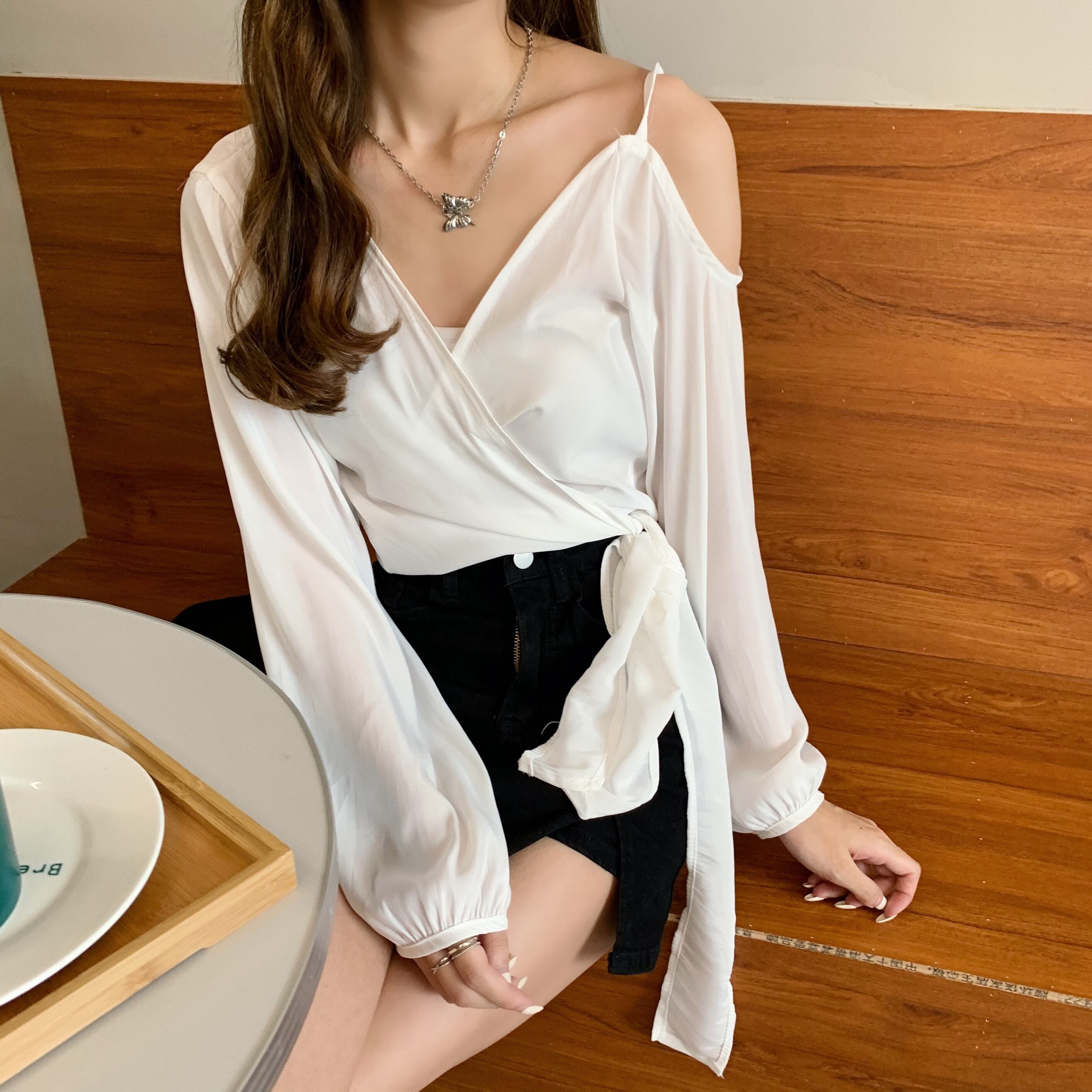 ✞ Vネッククロスストラップ ショートストラップレス長袖スリーブシャツブラウス ロング スウィート ✞ゴスロリ SM ミリ 甘ロリ クラロリ 和ロリ エレガント 黒ロリ 姫ロリ 華ロリ BB-BB1636810