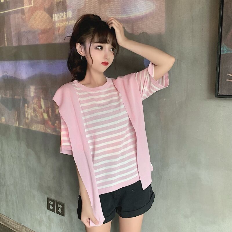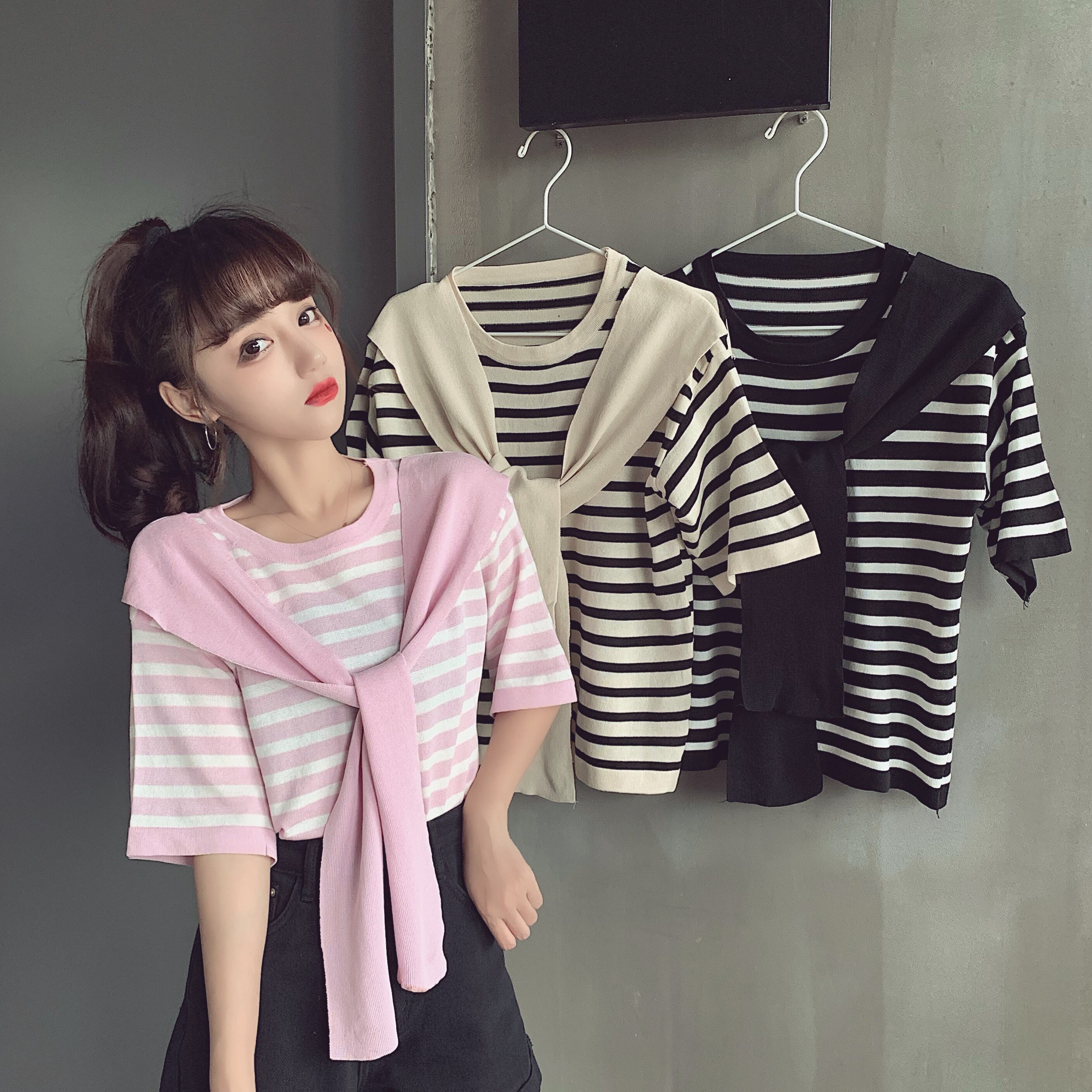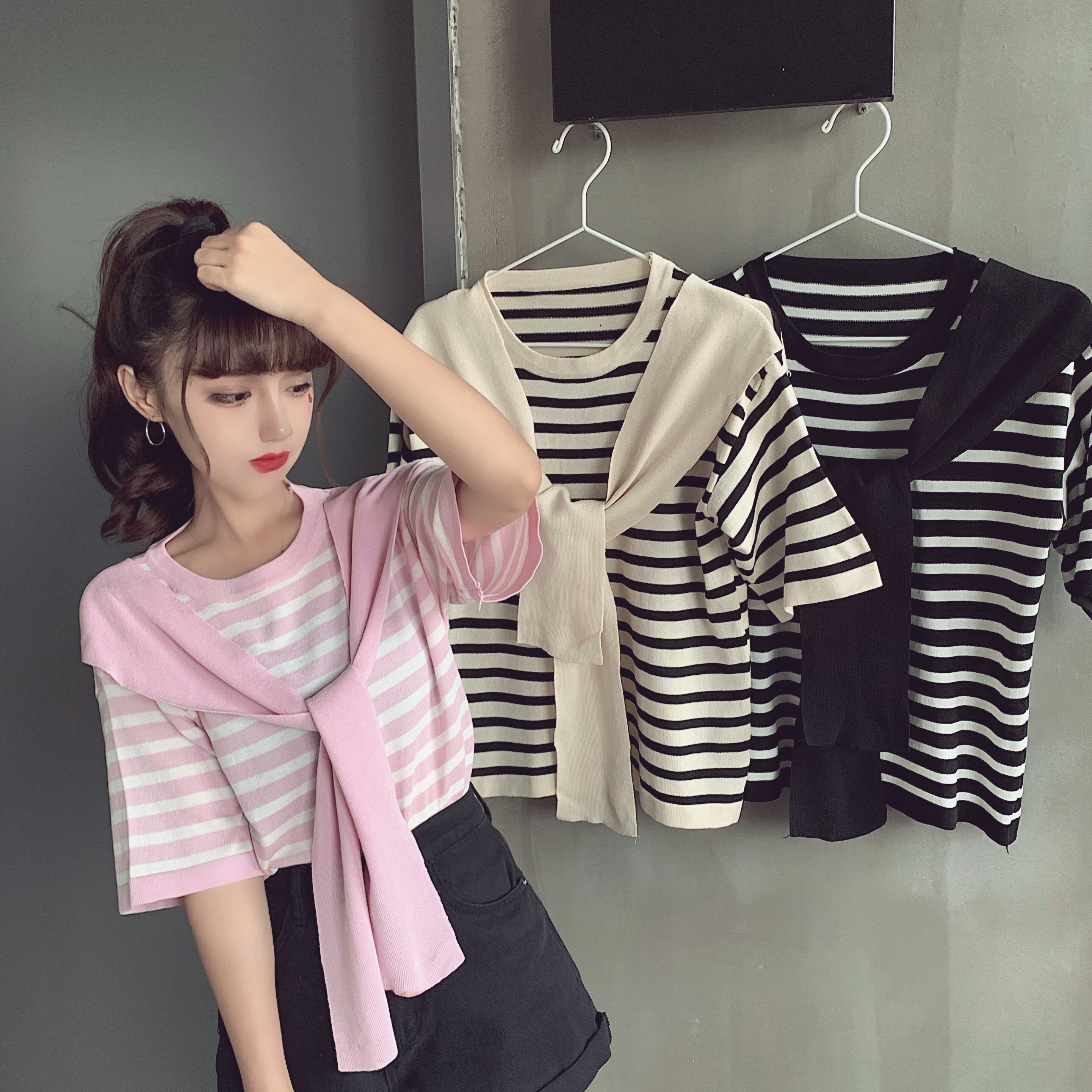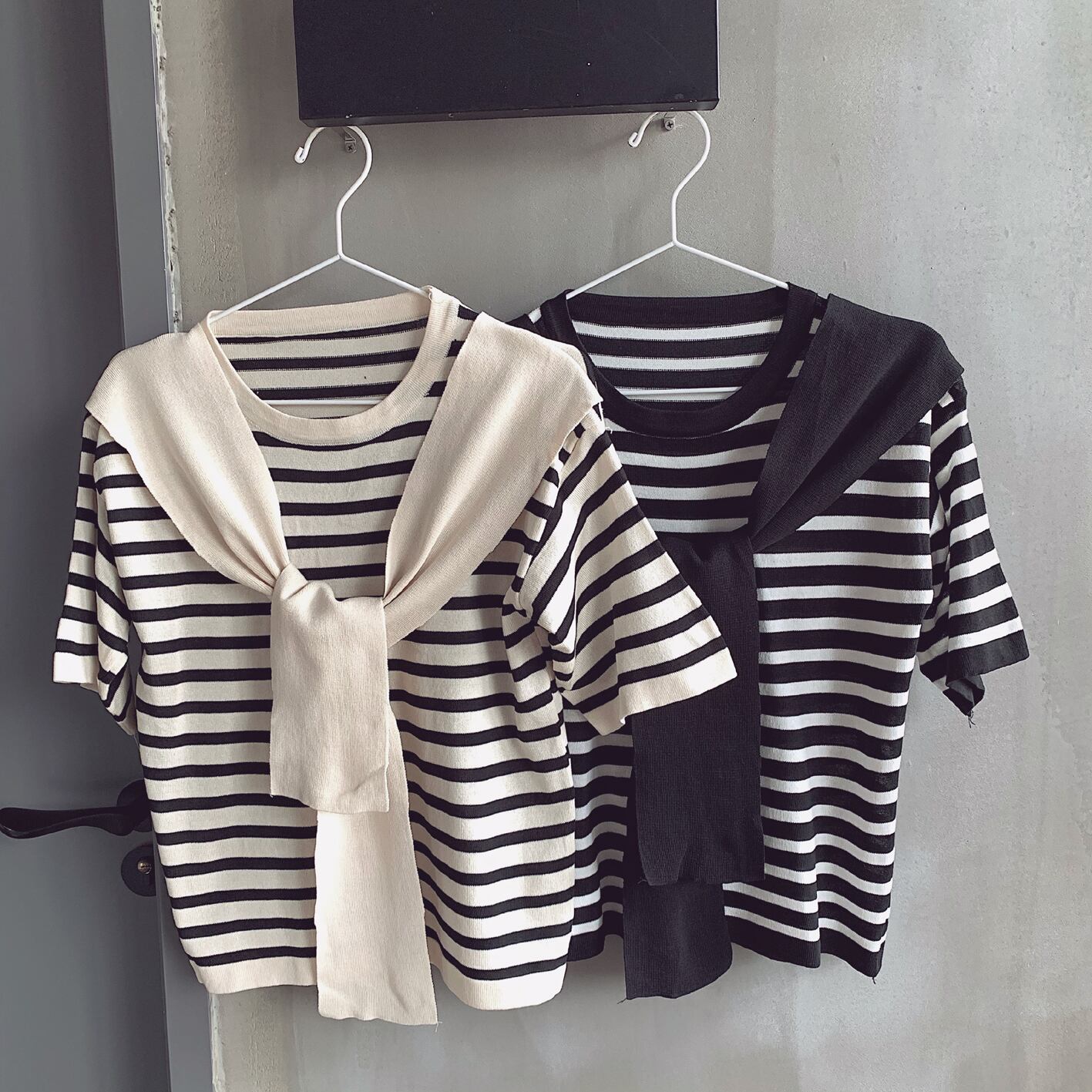 ✞ きれいめ☆♥カワイイ♥ストライプラウンドネック半袖スリーブセーター シャツブラウス ショート ✞ゴスロリ SM ミリ 甘ロリ クラロリ 和ロリ エレガント 黒ロリ 姫ロリ 華ロリ BB-BB5539737