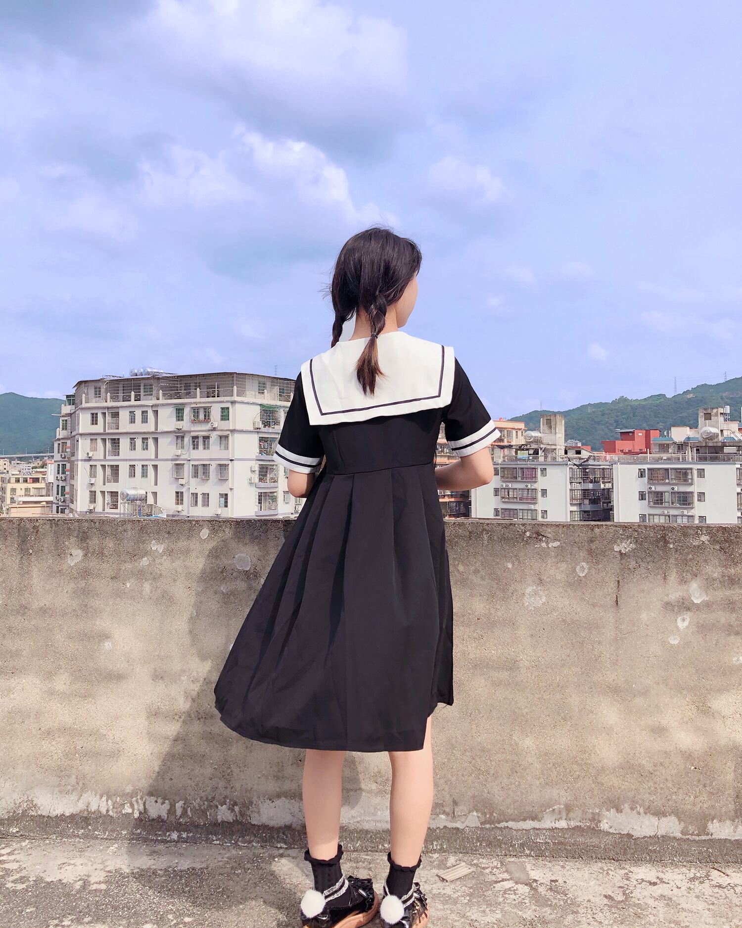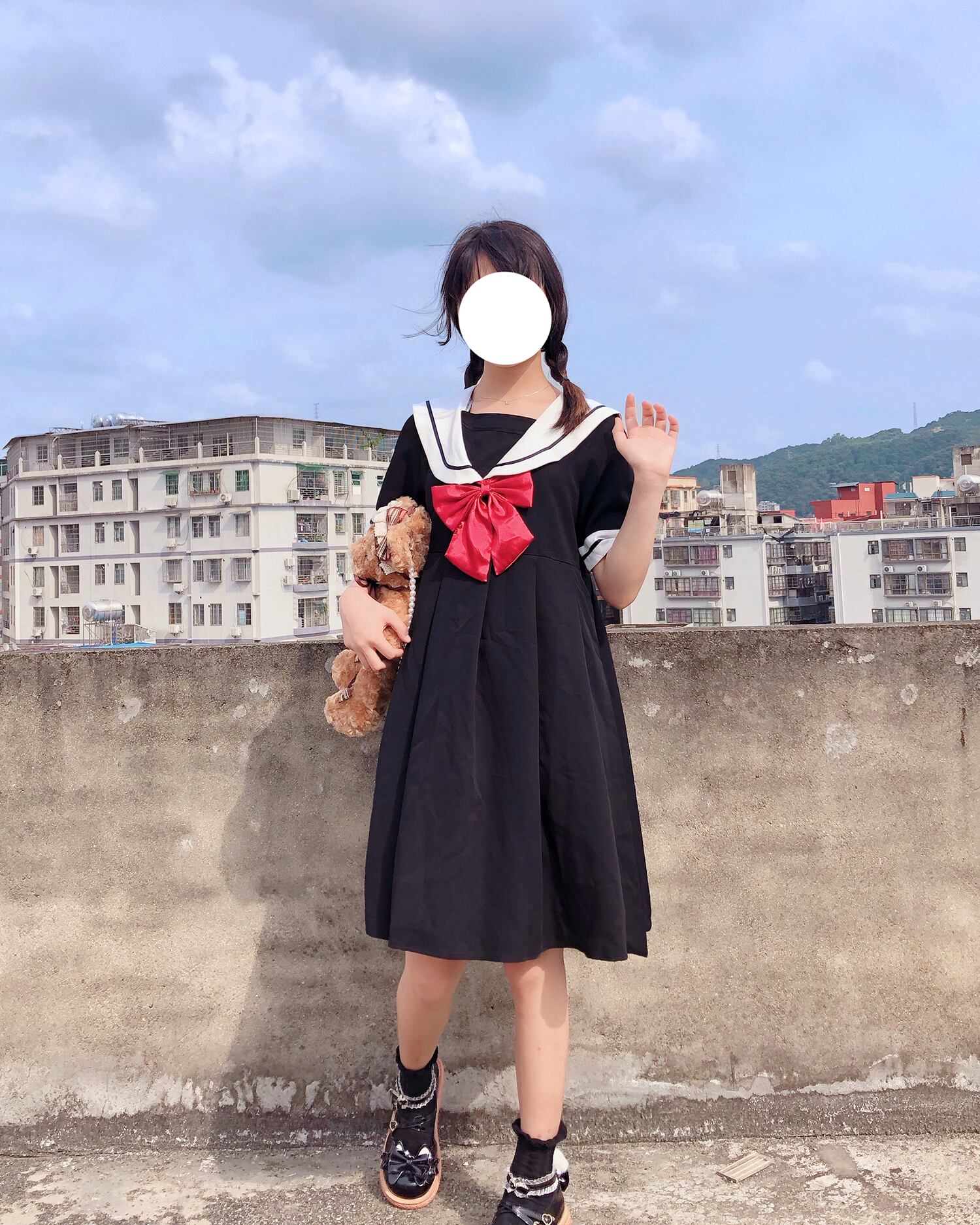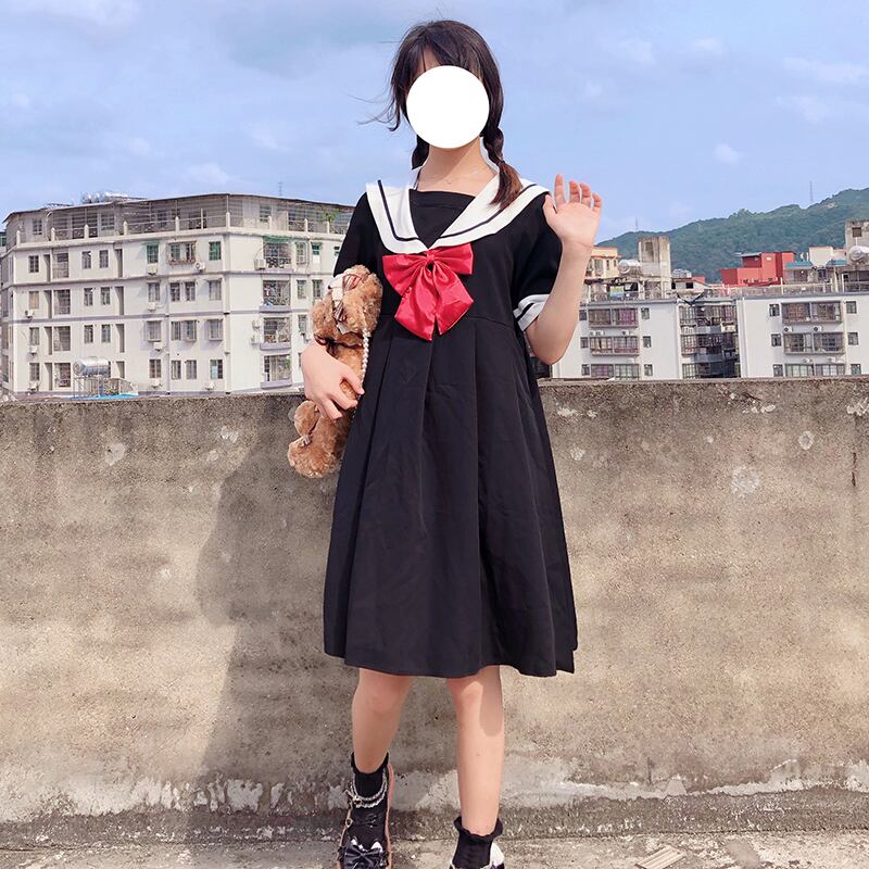 ✞ スカート 制服 ネイビーリボン半袖スリーブプリーツワンピースドレスOP ショート ✞ゴスロリ SM ミリ 甘ロリ クラロリ 和ロリ エレガント 黒ロリ 姫ロリ 華ロリ BB-BB9106759