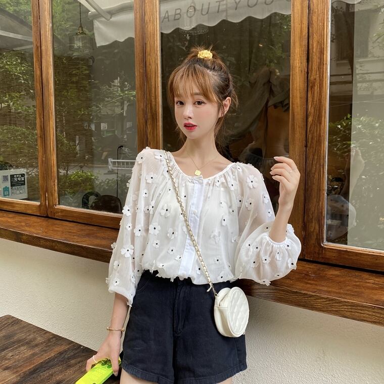 ✞ 花柄ラウンドネック白スリーブシフォンシャツブラウスブラウス ホワイト スウィート フラワーデザイン ✞ゴスロリ SM ミリ 甘ロリ クラロリ 和ロリ エレガント 黒ロリ 姫ロリ 華ロリ BB-BB3730573