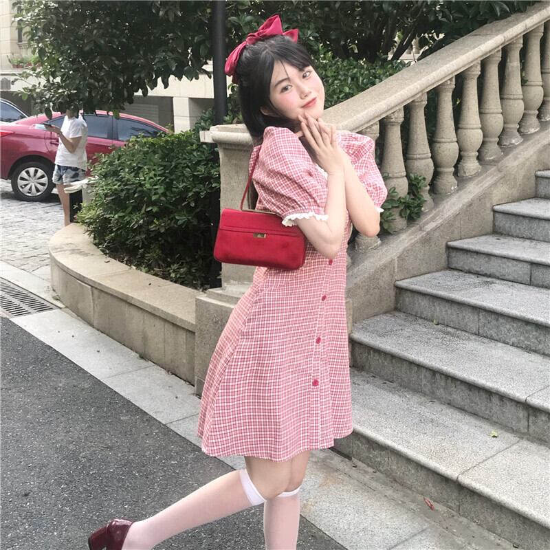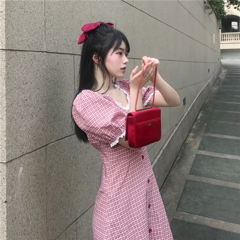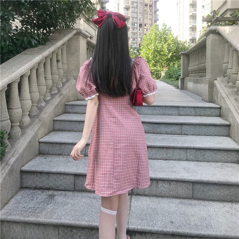 ✞ チェック柄レースパフスリーブAラインチュニック ワンピースドレスOP♥カワイイ♥スウィート スクウェア ✞ゴスロリ SM ミリ 甘ロリ クラロリ 和ロリ エレガント 黒ロリ 姫ロリ 華ロリ BB-BB4045981