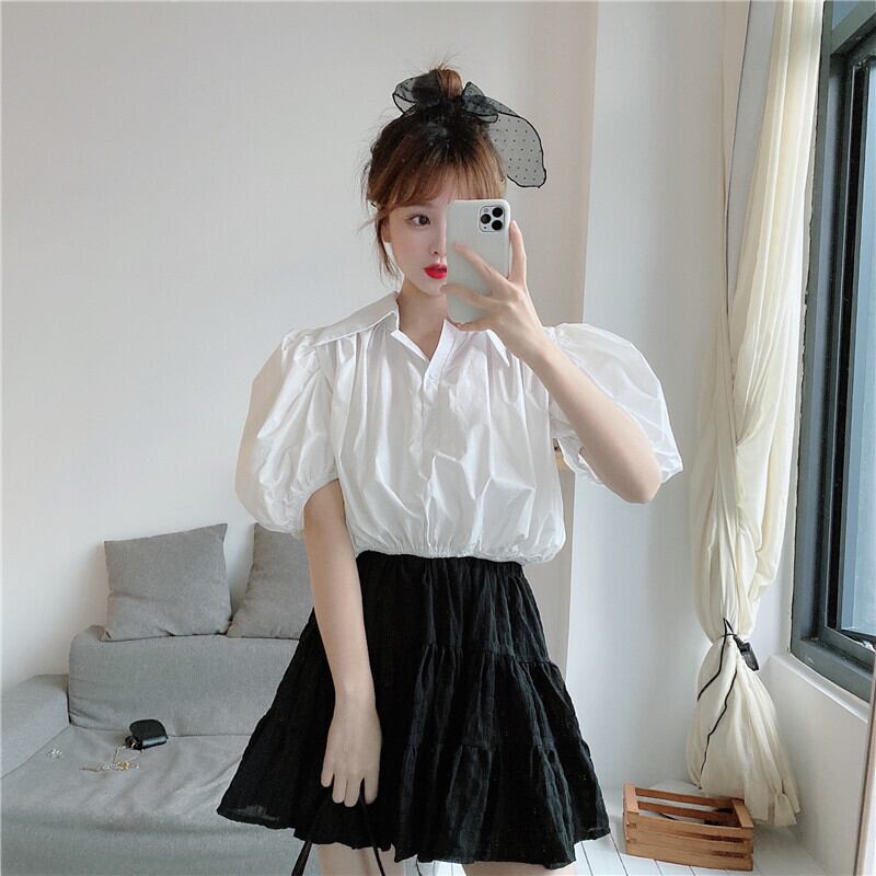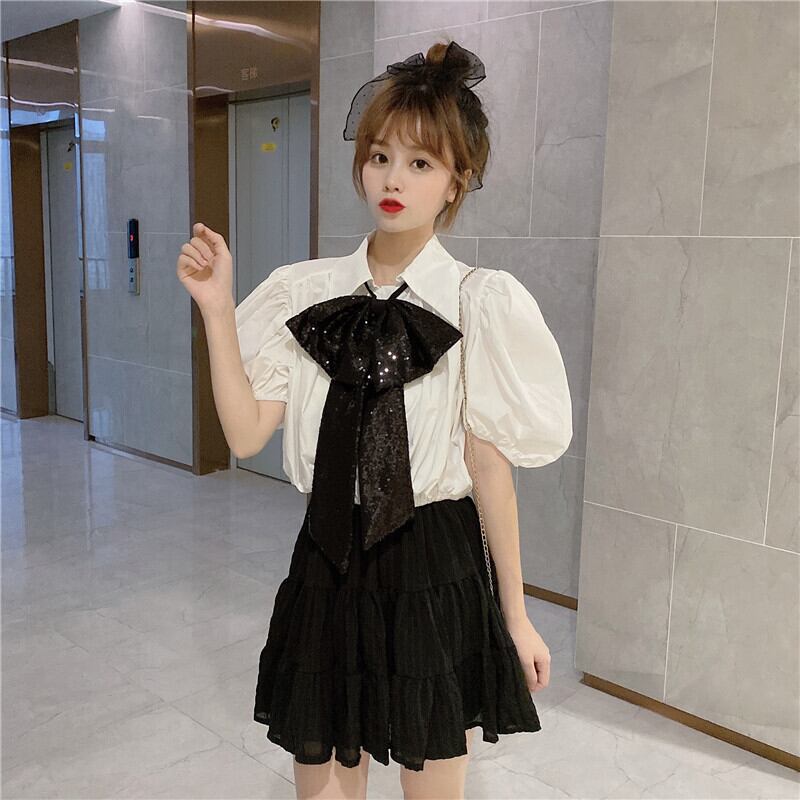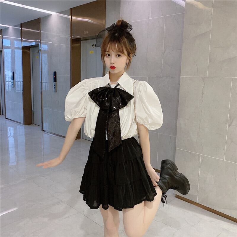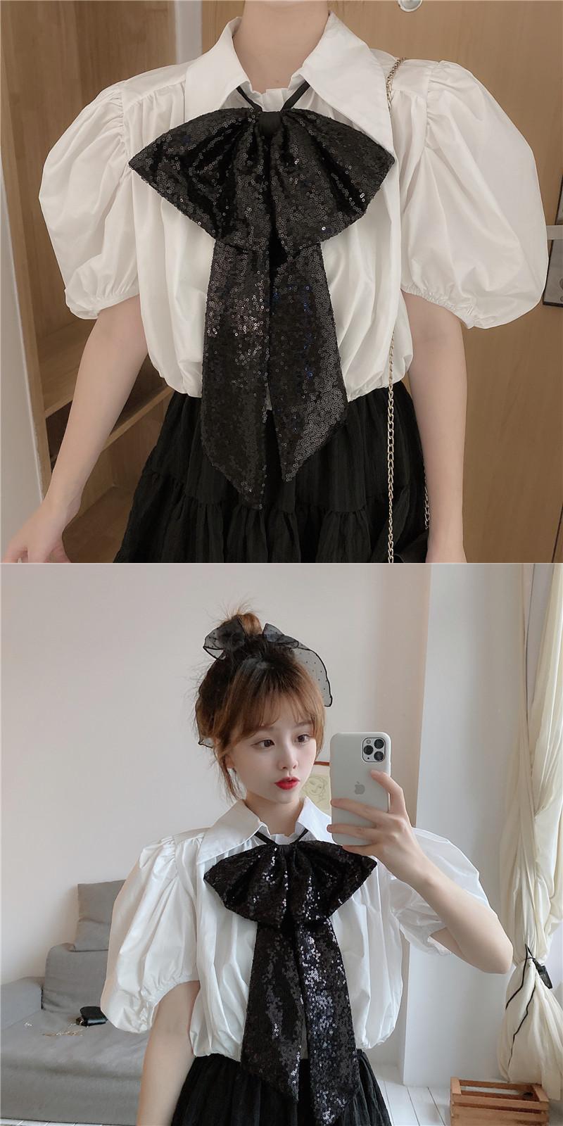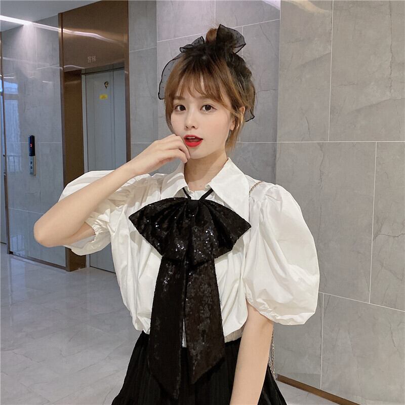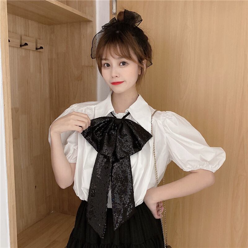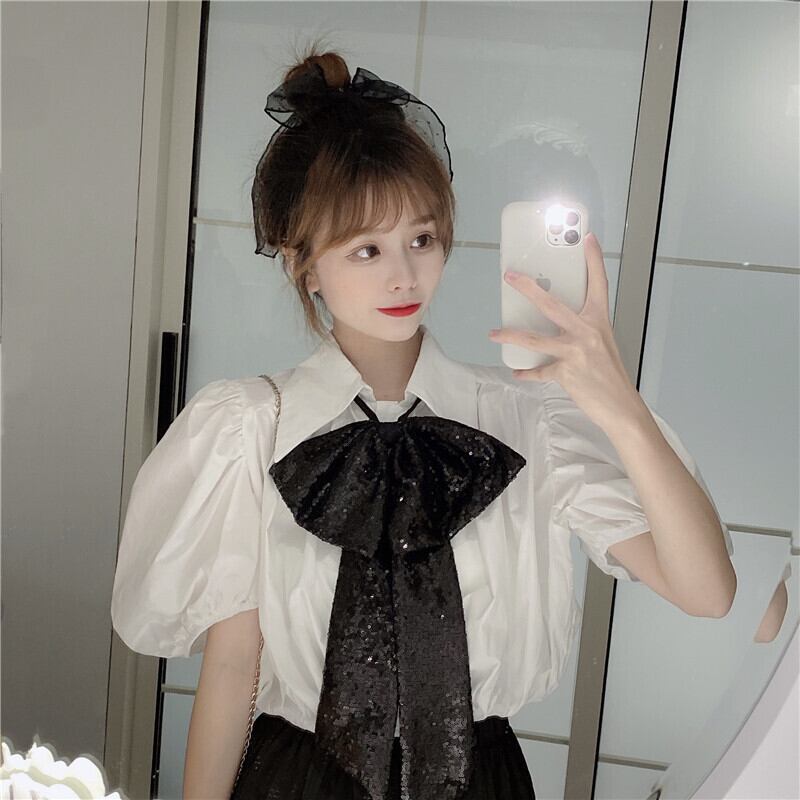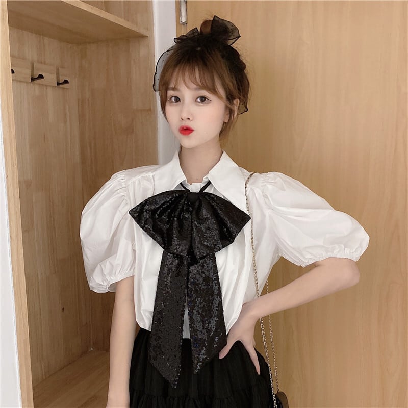 ✞ きれいめ清楚☆黒りぼん+プリーツランタンスリーブシャツブラウス トップス 大人女子☆ネクタイ ショートシャツ ブラウス ✞ゴスロリ SM ミリ 甘ロリ クラロリ 和ロリ エレガント 黒ロリ 姫ロリ 華ロリ BB-BB5158511