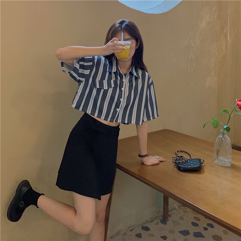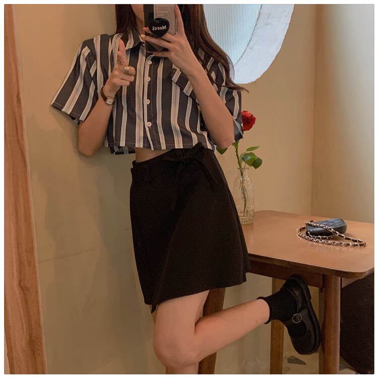 色:ブルーストライプシャツ,黒の短いスカートS,黒の短いスカートM