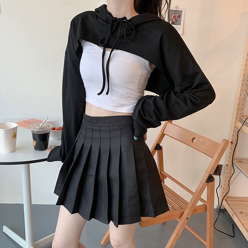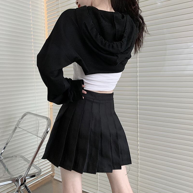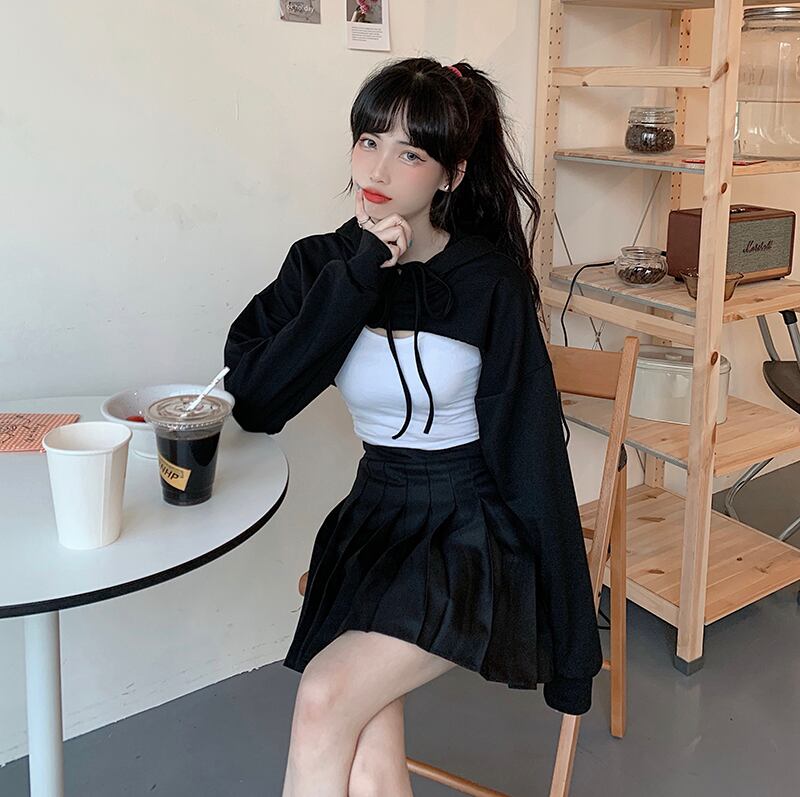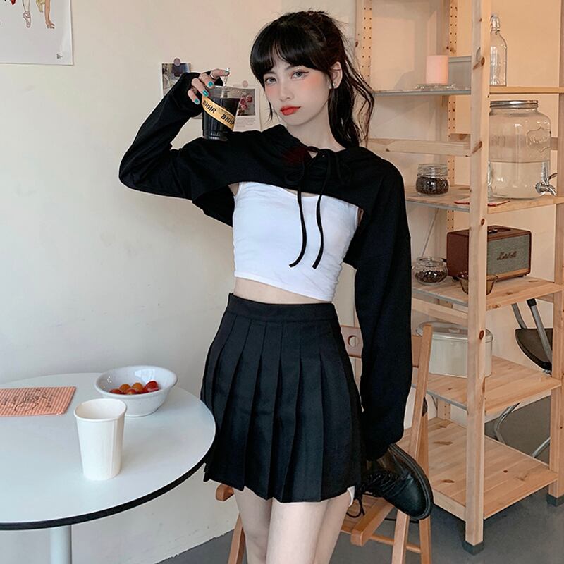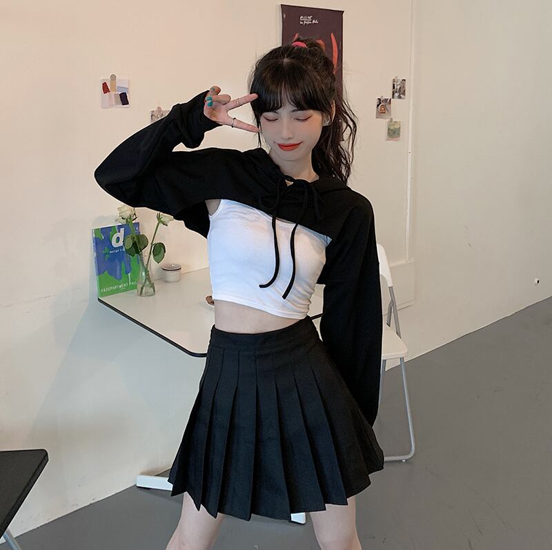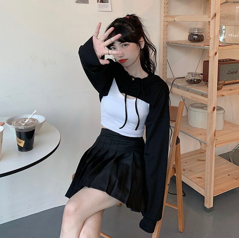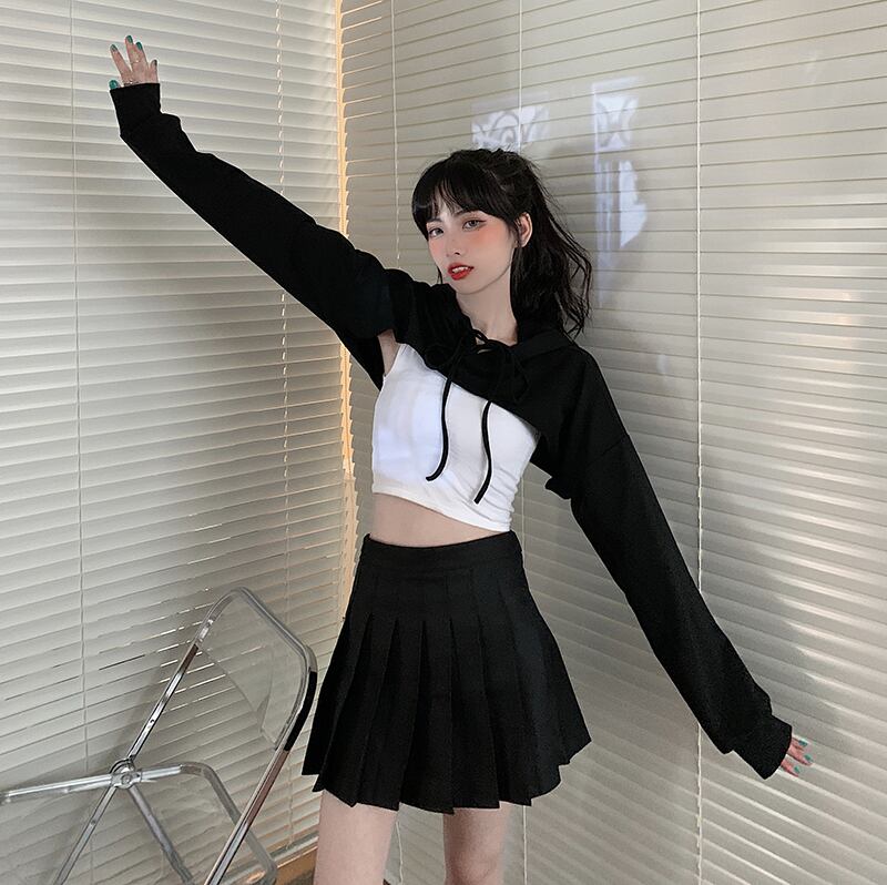 ✞ ダークネス黒 ブラックxホワイトショート丈トップス フードセーター ☆ロングスリーブ ✞ゴスロリ SM ミリ 甘ロリ クラロリ 和ロリ エレガント 黒ロリ 姫ロリ 華ロリ BB-BB8489317