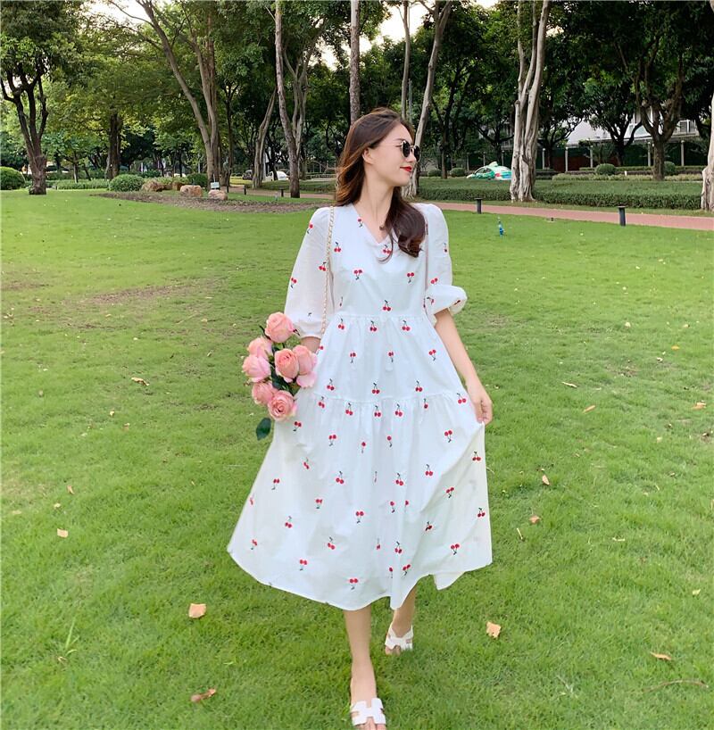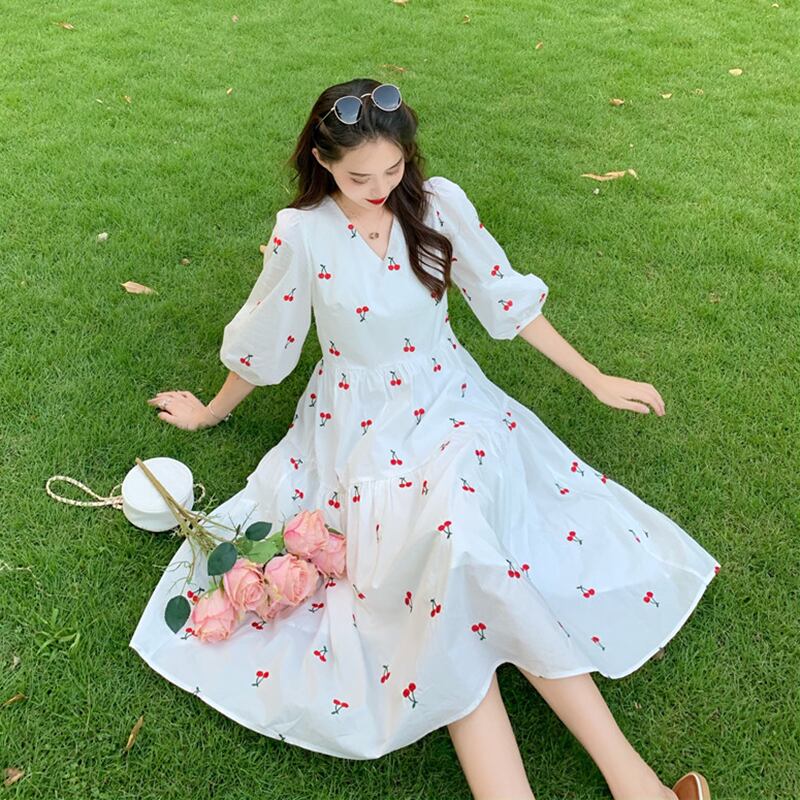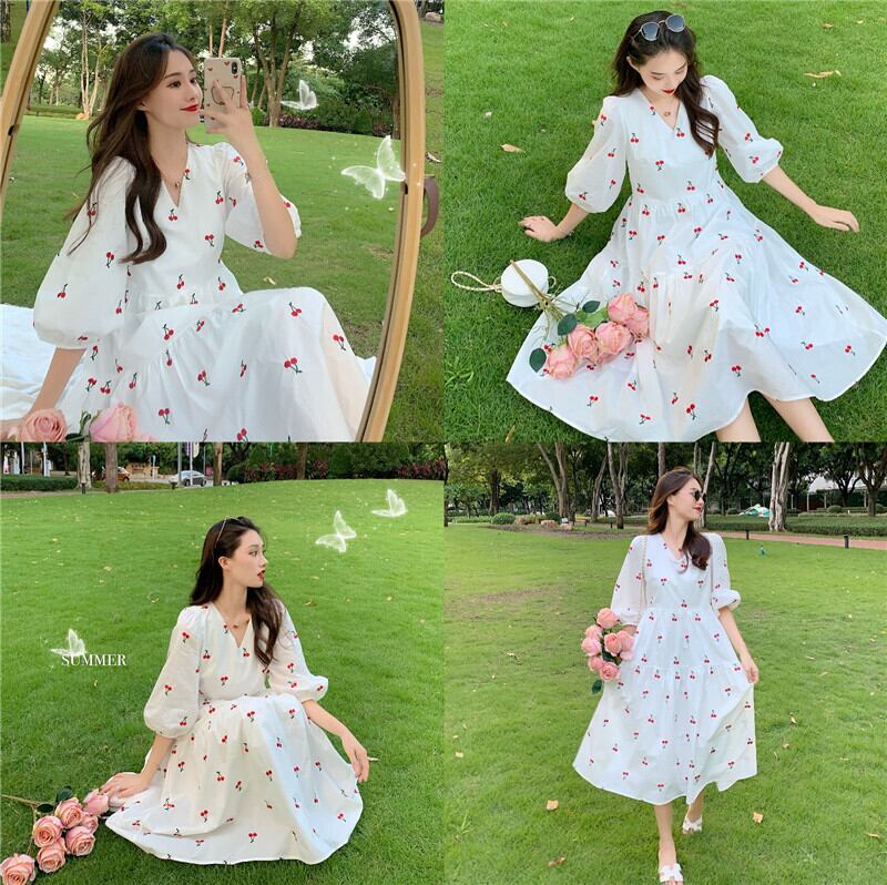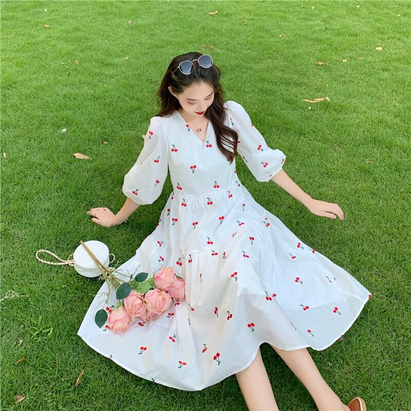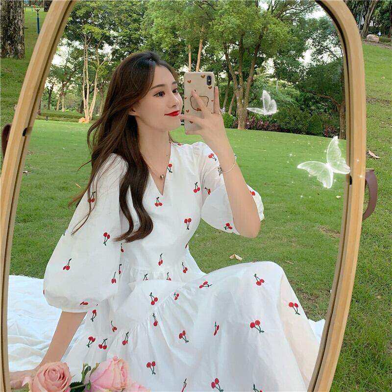 ✞ チェリーVネックランタンスリーブシフォンワンピースドレスOP♥カワイイ♥ スウィート ✞ゴスロリ SM ミリ 甘ロリ クラロリ 和ロリ エレガント 黒ロリ 姫ロリ 華ロリ BB-BB9218896