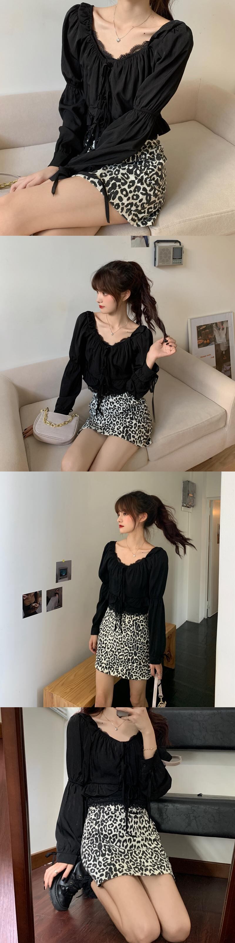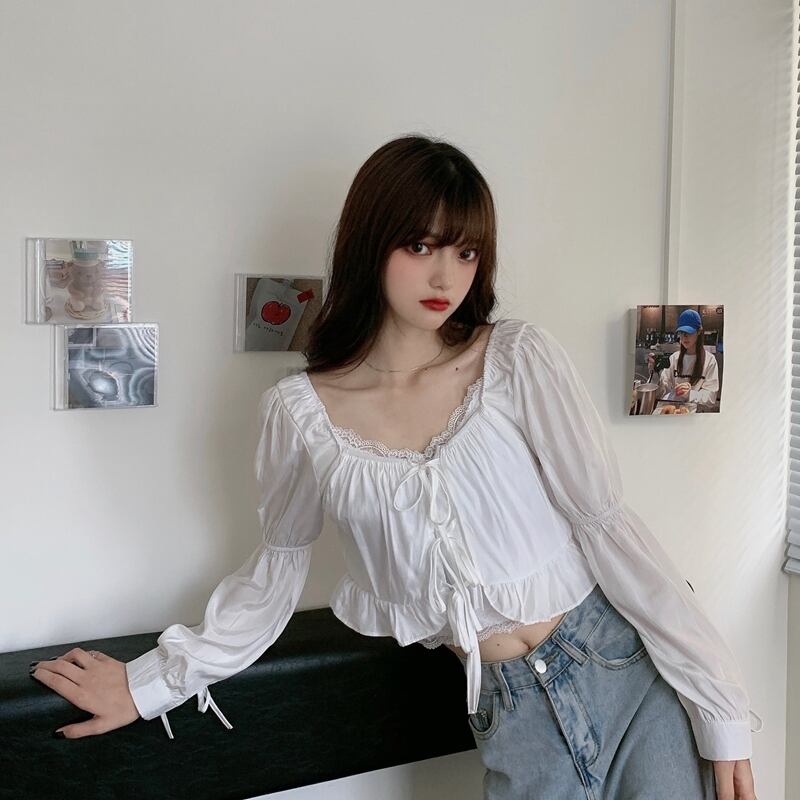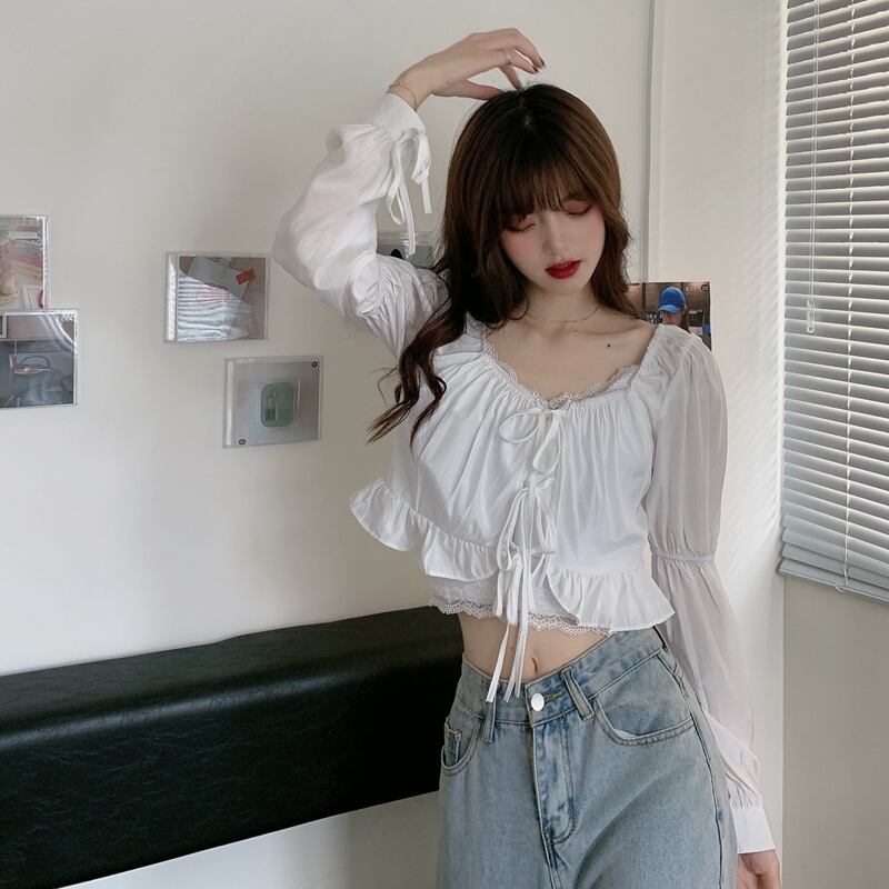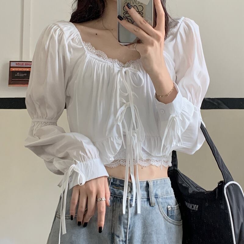 ✞ ショートトップス スリーブリボンプリーツウエストすっきり☆着痩せ長袖シャツブラウス ロング スウィート スクウェア ✞ゴスロリ SM ミリ 甘ロリ クラロリ 和ロリ エレガント 黒ロリ 姫ロリ 華ロリ BB-BB3292285