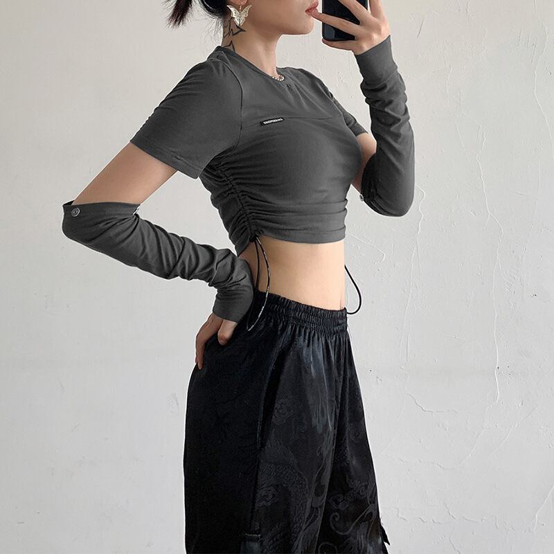 ✞✝✞ スリーブTシャツ 大人女子☆ショートスリムフィットグレーハイウェストボタンギャザートップス コットン ✞✝✞ ゴスロリ SM ミリ 甘ロリ クラロリ 和ロリ エレガント 黒ロリ 姫ロリ 華ロリ AA-AA7321052