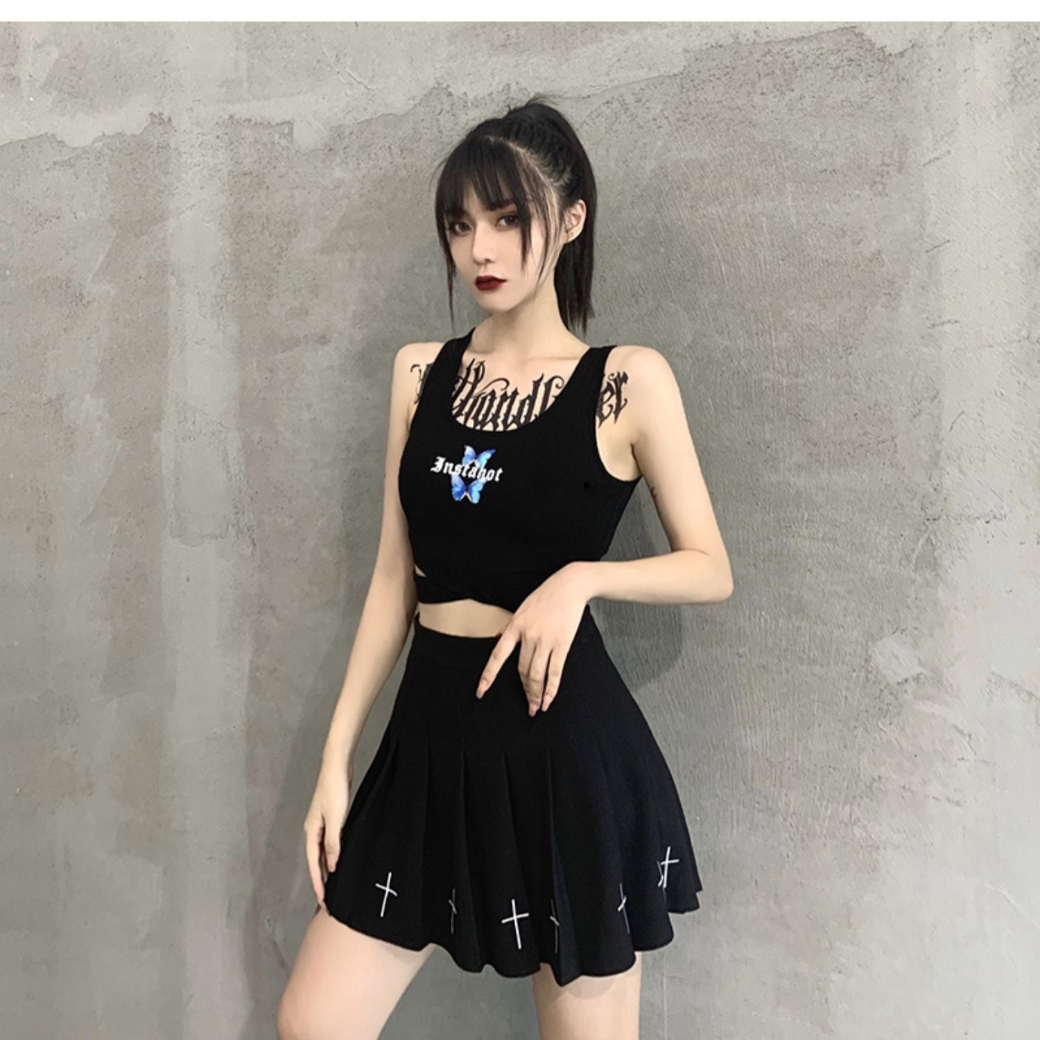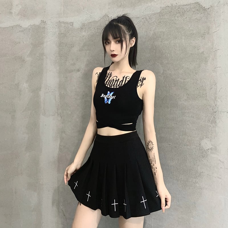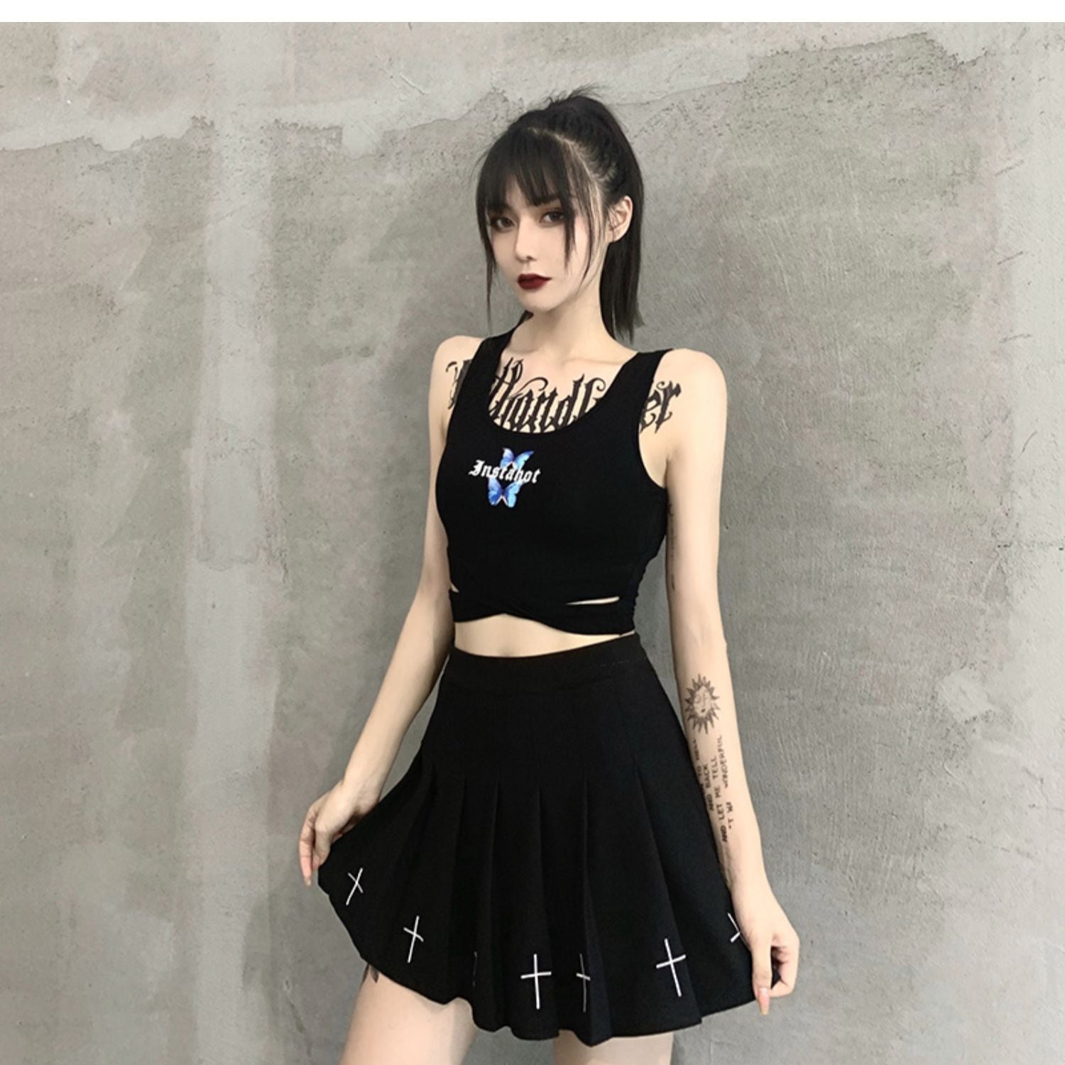 ✞✝✞ ブラックノースリーブプリントクロスショートトップス コットン ピュア ✞✝✞ ゴスロリ SM ミリ 甘ロリ クラロリ 和ロリ エレガント 黒ロリ 姫ロリ 華ロリ AA-AA5675662