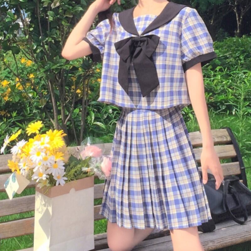 ✞ ネイビーチェック柄スリーブ半袖トップス プリーツスカート ショート 半袖スリーブ ✞ゴスロリ SM ミリ 甘ロリ クラロリ 和ロリ エレガント 黒ロリ 姫ロリ 華ロリ BB-BB58314022981