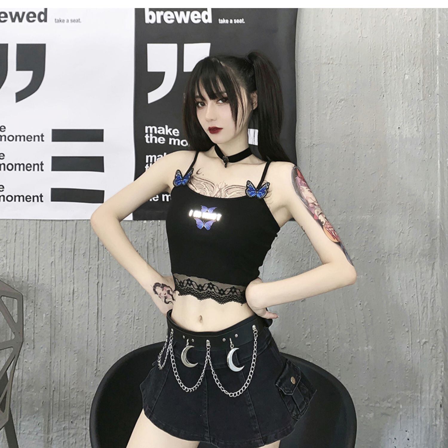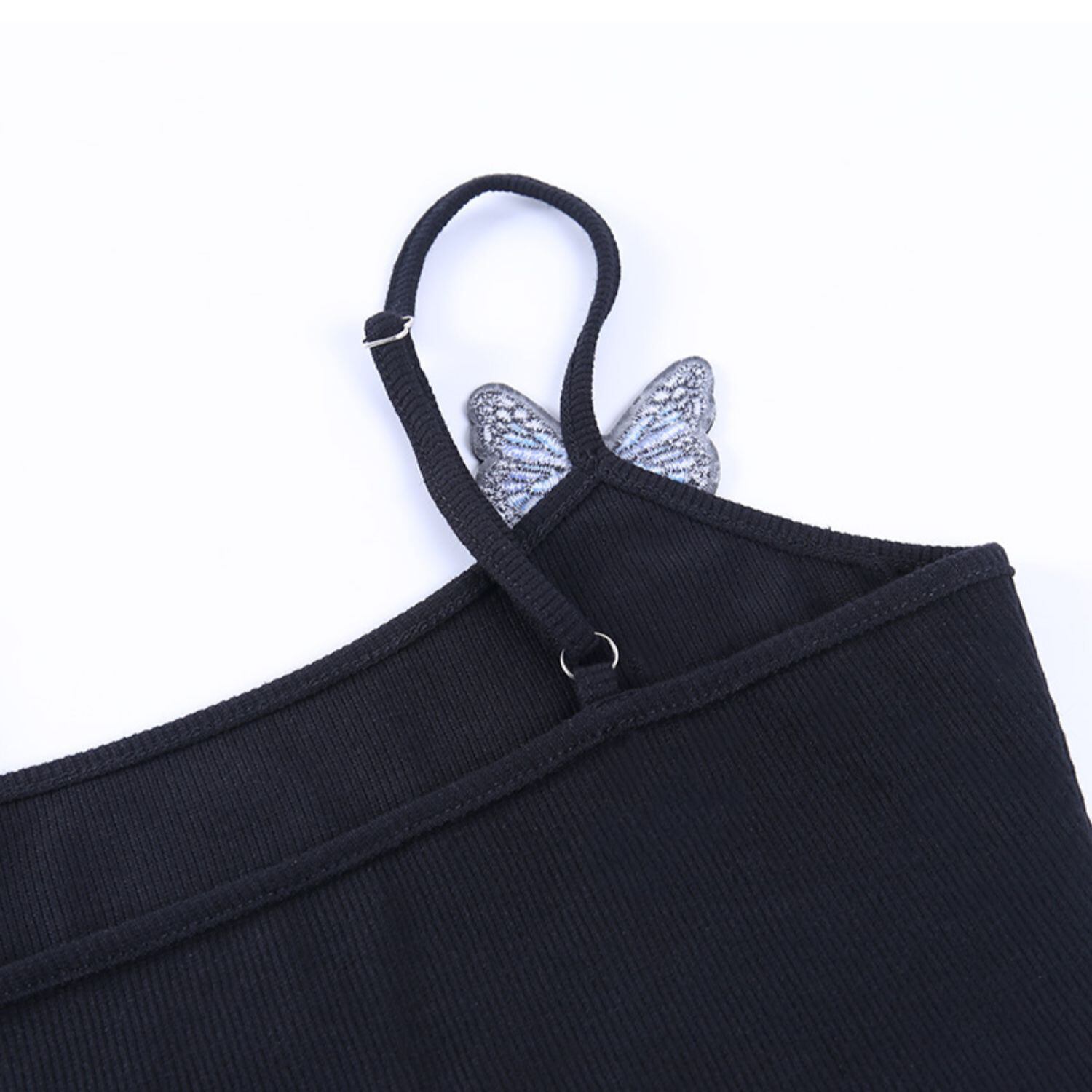 ✞✝✞ ブラックButterflyデザイン キャミソール大人女子☆レーススリムショートトップス ステッチ ✞✝✞ ゴスロリ SM ミリ 甘ロリ クラロリ 和ロリ エレガント 黒ロリ 姫ロリ 華ロリ AA-AA77099711070